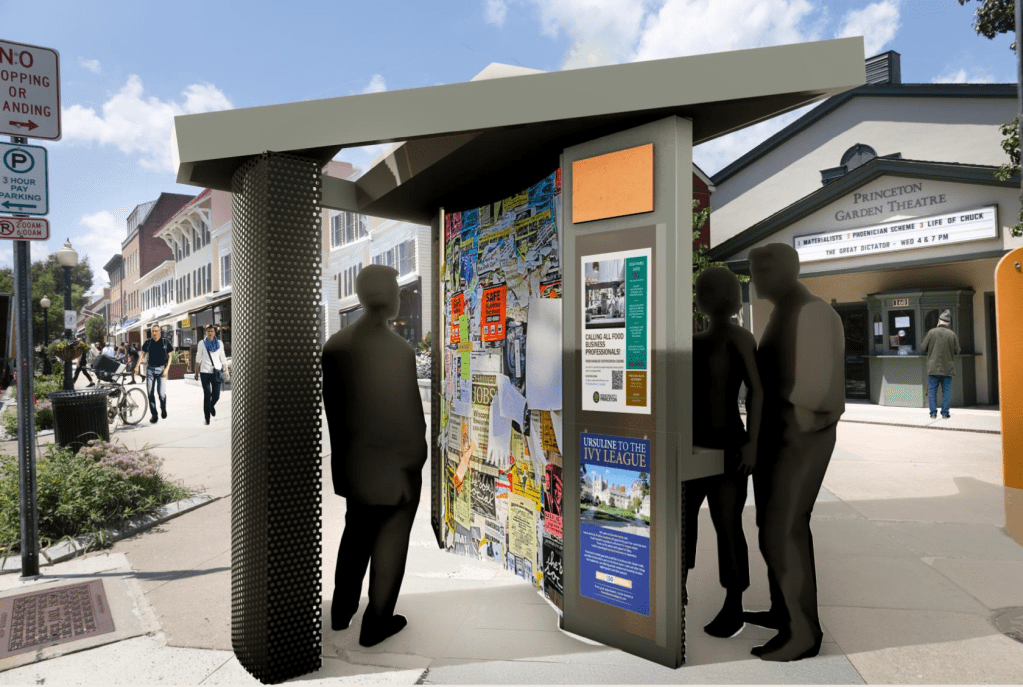 On Monday night, Princeton Council will discuss the winners of the design contest that was launched last year to identify potential replacements for the information kiosk on Nassau Street. (Report: “American Institute of Architects Launching Design Competition to Upgrade Princeton Information ‘Kiosks’“) The presentation has been published on the municipal website as part of the meeting packet, so we have a pretty good idea what designs are going to be winners. In the ‘professional’ category, the design shown above, by Studio Hillier, was the overall winner.