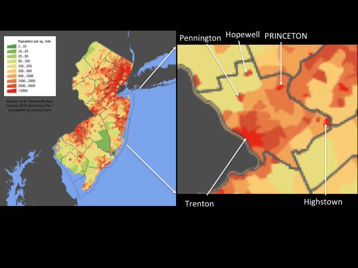 All around NYC, a huge ring of high population density extends, reflecting how the city burst out of its borders and engulfed the surrounding areas in the second half of the twentieth century. The sprawl extends south, through Union and Middlesex counties, with a finger of high-density extending along the Route 1 corridor essentially all the way to Trenton. Here, we find Princeton. Zooming in on Mercer County (above, right), we see that Princeton lies in what is already a fairly urbanized area. Especially to the south around Route 1, we see higher population density, consistent with the rapid development the area has seen in recent decades.