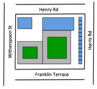 Layout of AvalonBay buildings (gray) at former Princeton Hospital site. Existing buildings, which would not be affected by the AvalonBay plan are colored blue. Note the two central courtyard-style open spaces (green).