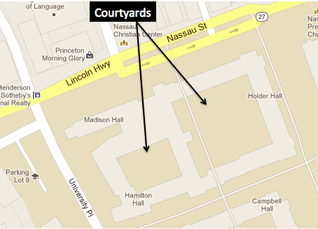 In 2012, the Princeton Planning Board considered a proposal from AvalonBay to build a 280-unit residential apartment community on the former Princeton Hospital Site on Witherspoon Street. The proposal from AvalonBay was ultimately rejected and is now the subject of litigation. (-Update 4.2.2013-Subject to an agreement with the Princeton Council, the original AvalonBay plan with the courtyard layout has been re-designed and the litigation is currently on hold-) One of the most bizarre allegations made by opponents of the original AvalonBay plan was that it would be a ‘gated community’. We heard this idea of a ‘gated community’ repeated time and again in letters to local news outlets. But the AvalonBay development had no gate, and in fact was laid out in essentially the same courtyard format of Hamilton/Holder Hall! Let’s take a look at the planned layout of the buildings in the original AvalonBay plan: