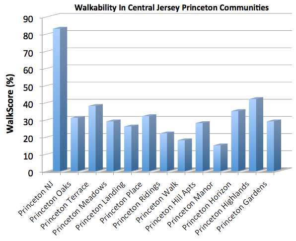 It’s fine for people to find a home that suits them outside of Princeton. But suburban Princeton communities are also united by another key feature: they are car-dependent. Last week, we looked at ‘Walkscore’, a tool for measuring how easy it is to access stores and amenities without using a car in any particular neighborhood. We used WalkScore to estimate how walkable twelve suburban ‘Princeton’ neighborhoods are (see graph above). The scores were all low, ranging from 15% for ‘Princeton Manor’ to 42% for Princeton Highlands, with an average Walkscore of 29%. These scores are considered to mean that ‘most’ or ‘almost all’ activities require use of a car. By contrast, the old Princeton Hospital site, where a neighborhood group is trying to downzone walkable development, has a Walkscore of 83%, meaning that ‘most errands can be accomplished on foot’.