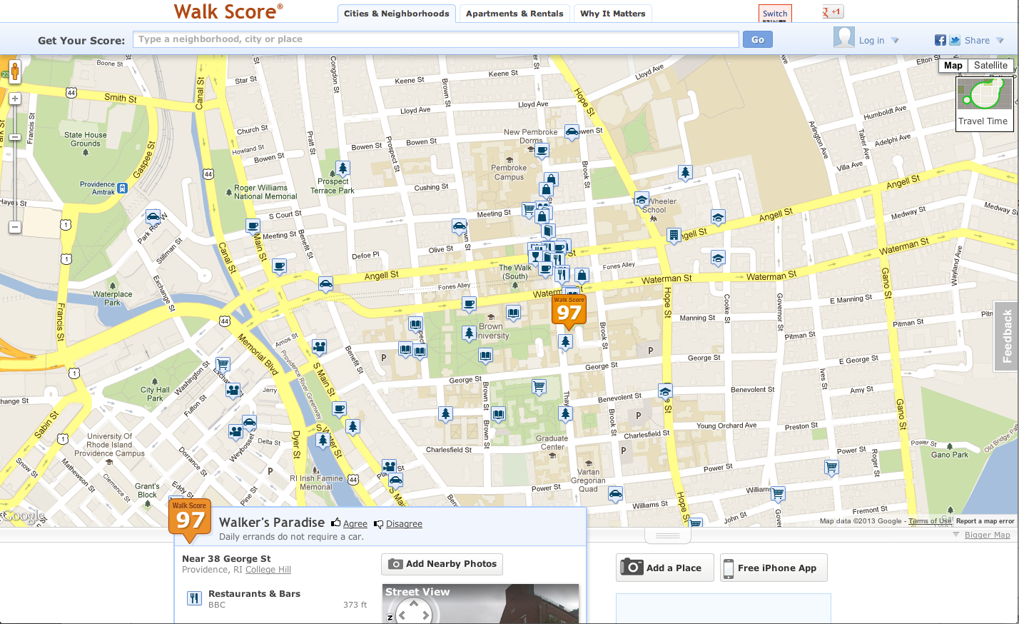 Screengrab of Walkscore for Brown University, showing how the campus is integrated around city streets. (Click for larger view).