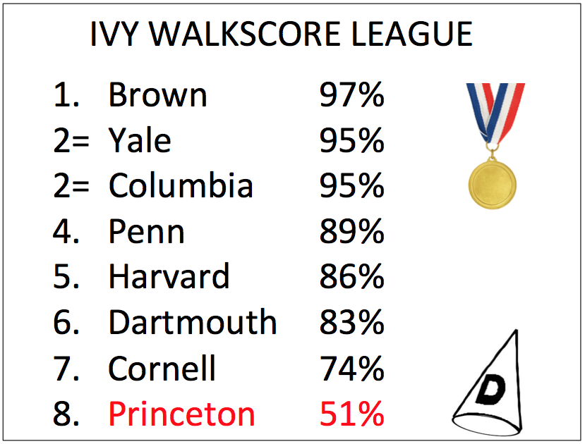 With this in mind, we made a league table of Ivy League Schools based on  Walkscore ratings from www.walkscore.com. Shockingly, Princeton University placed dead last! In fact, although the other Ivy League Schools showed a range of [pretty high] Walkscores -from 74% at Cornell to 97% at 1st-placed Brown- Princeton showed up as an outlier, with a Walkscore of just 54%!