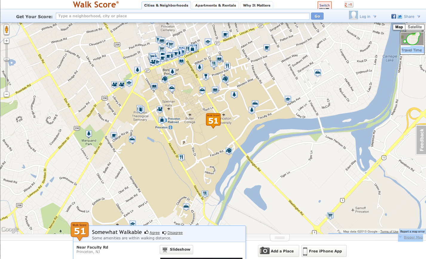 Walkscore screengrab: Princeton U appears to be represented by the Roberts Statium