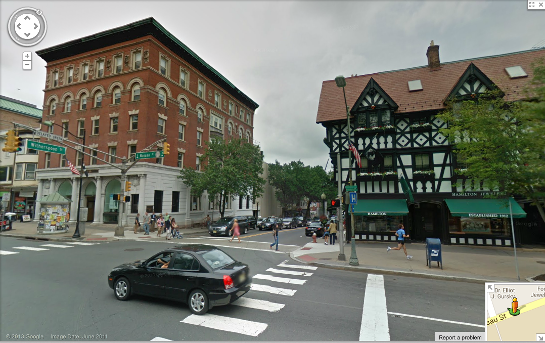 Intersection of Nassau Street and Witherspoon Street, the heart of historic downtown Princeton and inspiration for ‘Walkable Princeton’ logo, as seen from Google Street view. (Click to expand.)