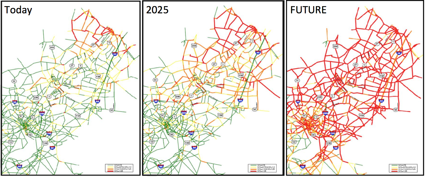 Current and projected traffic in Central Jersey according to ‘Route 1 Growth Strategy’ report. Princeton is where 206 and 27 meet, just north of Rt 1. Red lines indicate heaviest traffic. (Click to expand.)