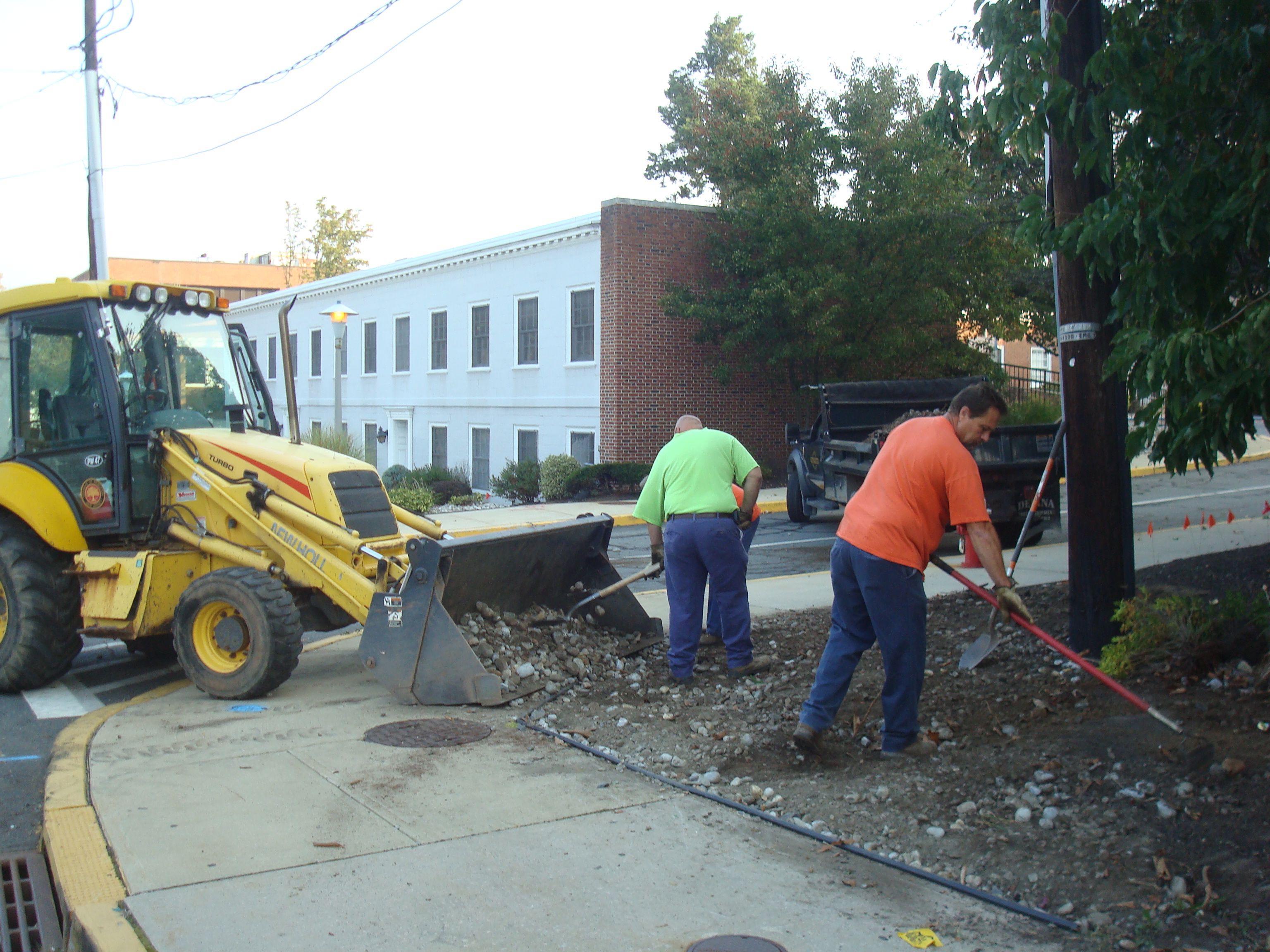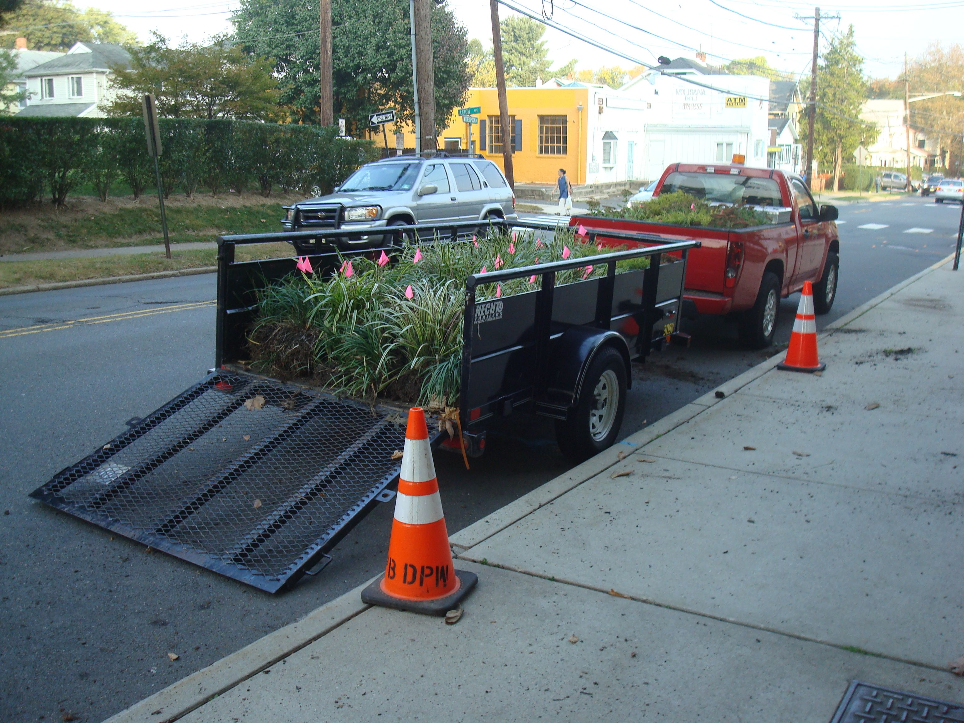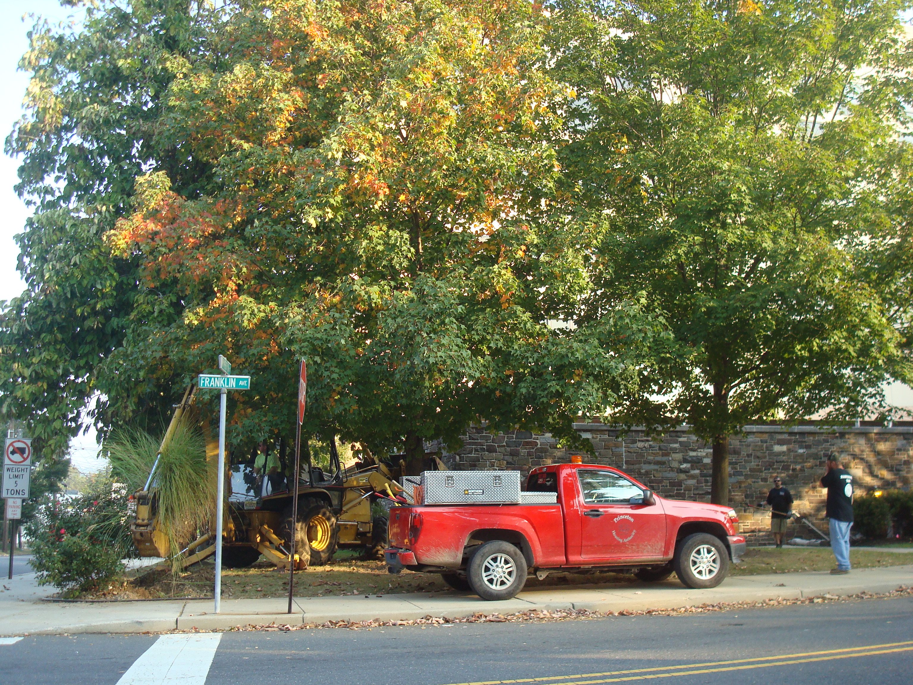 Scene of the Great Princeton Plant Rescue on Friday, October 4. DPW staff removed plants and landscaping features. In this photo, the old hospital tower is hidden behind a beautiful tree in fall color, but you can see a photo of it here. (Click to expand image).