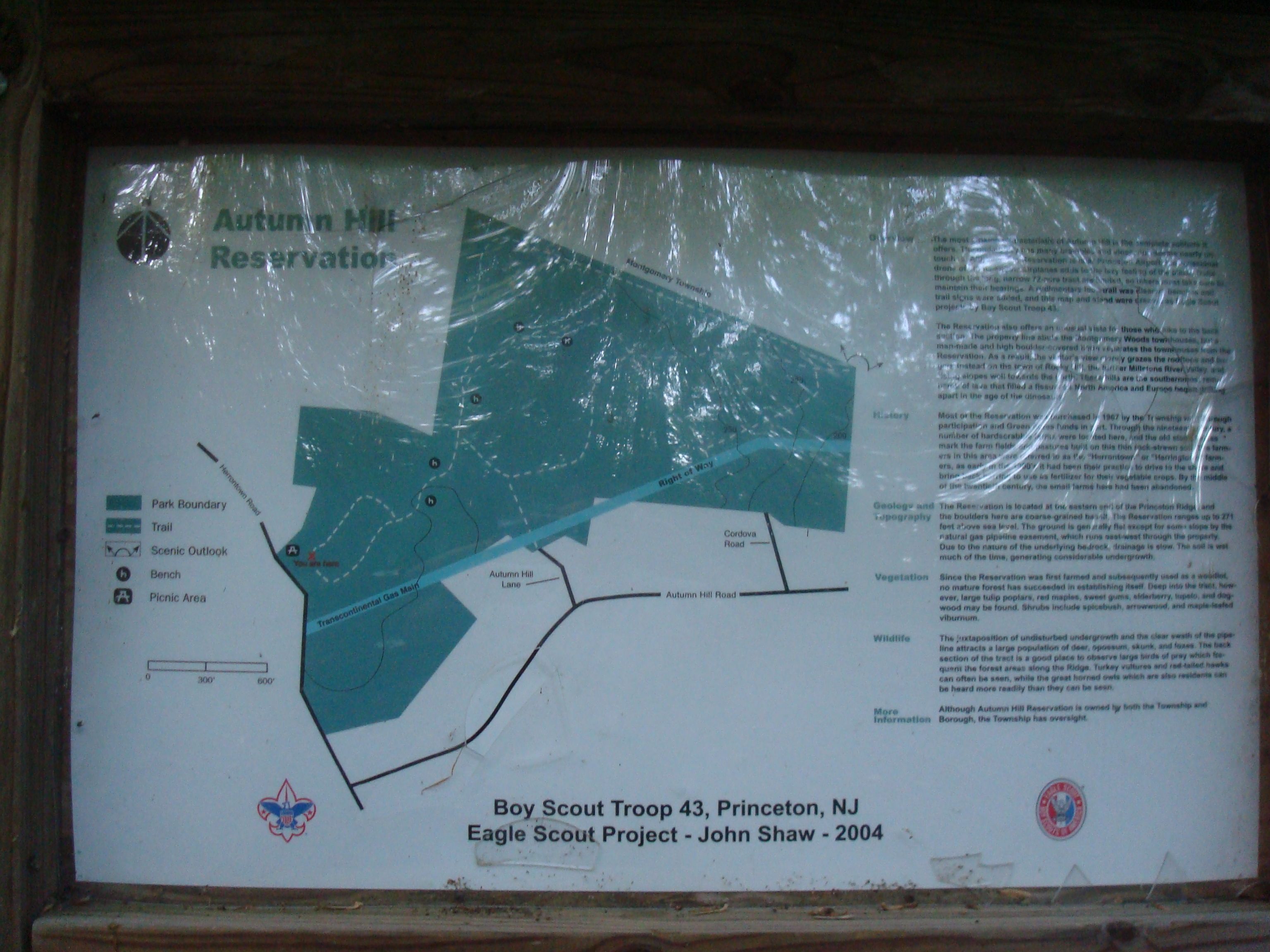 We can thank local Boy Scouts for the few trails and amenities that exist in Autumn Hills reservation.  In 1992, Boy Scouts of Troop 43 spent >150 hours cutting trails in the area. In 2004, local scout John Shaw added to this work as part of an Eagle Scout Project. This map at the entrance on Herrontown Road shows the location of the trails and indicates a ‘scenic overlook’ deep in the forest at the north-east edge of the park.