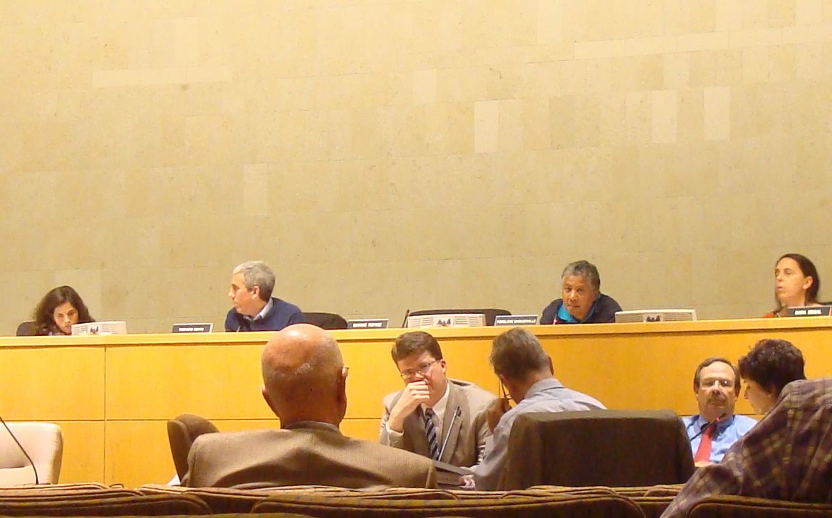 Princeton Zoning Board members Louisa Clayton, Richard Kahn, Penelope Baskerville and Sara Segal, with municipal officials at front, at the meeting on Wednesday night when they rejected the 255 Nassau Plan. (click to expand.)
