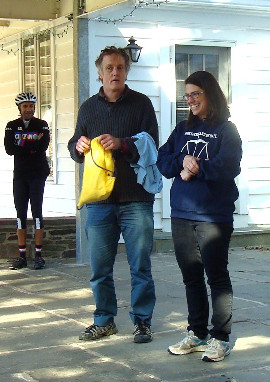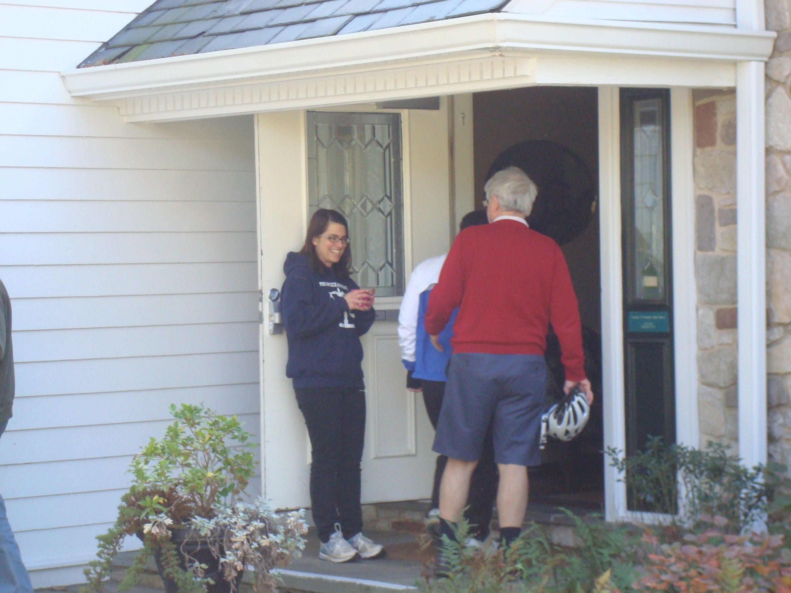 Mayor Lempert welcomes riders at the half-way point of the cycle ride, at Mountain Lakes House where hot cider was available. (click to expand.)
