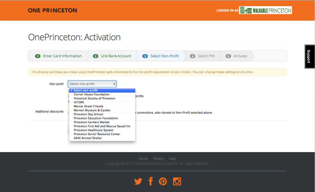 - Select your non-profit! This is the fun part! Who will you choose to be the recipient of your 1% donations? Corner House? Princeton Historical Society? HiTops? Fortunately, there’s a button you can click to split your donations among all the potential non-profits. That’s what we went for!