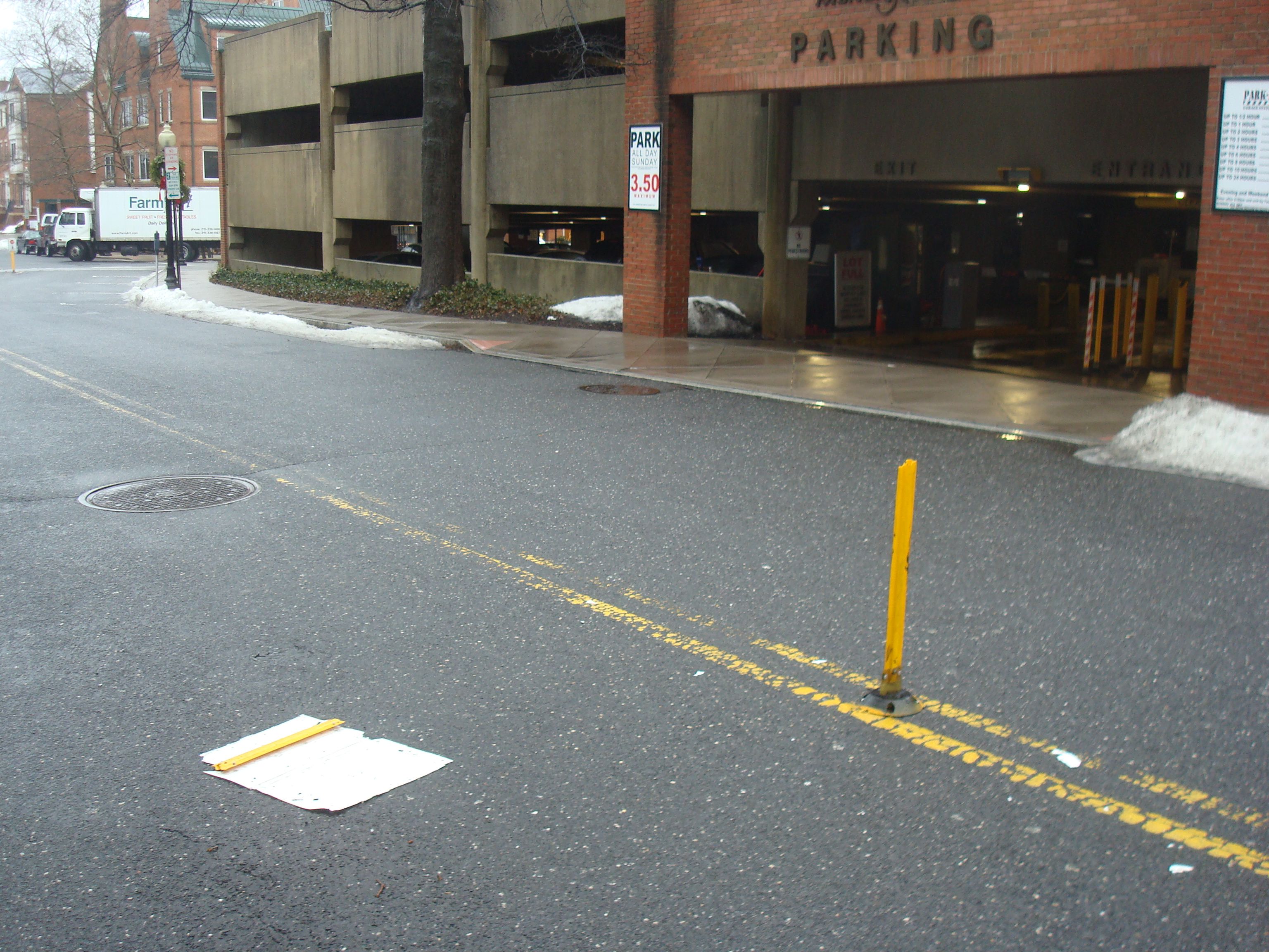 1. They’ve gotten nailed almost every week; the town has been very good about repairing them. That one gets hit the most; I think people turn left out of the garage, and then look right for oncoming traffic and forget it’s there. Moving it to the other side of the crosswalk might reduce that.