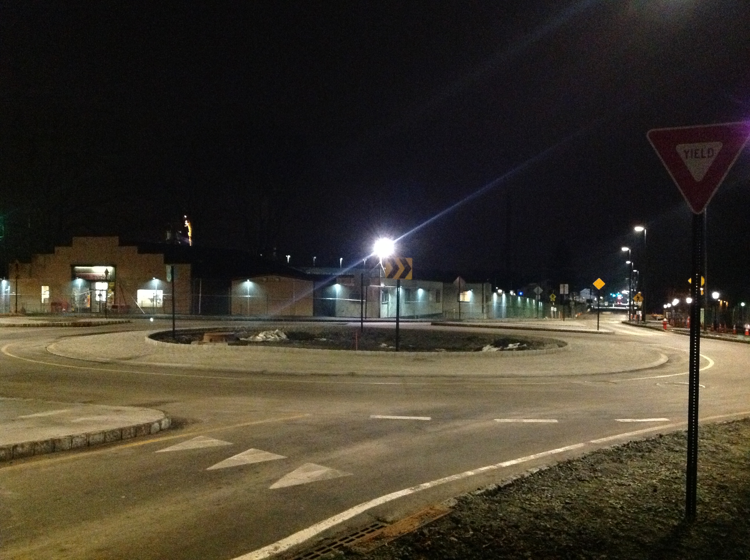 It will be interesting to see how the roundabout performs. It was doing fine under Superbowl-levels of traffic, but its first day of action is predicted to feature heavy snow in the morning rush hour. Most (but not all) car drivers using the roundabout last night seemed to ‘get’ how it works. You have to give way to traffic already on the roundabout. That does not mean that you have to stop before you enter the roundabout. If you do that, there is a very good chance of a rear-end crash, as a trailing driver will expect you to drive straight onto the roundabout if there are no vehicles already on it.