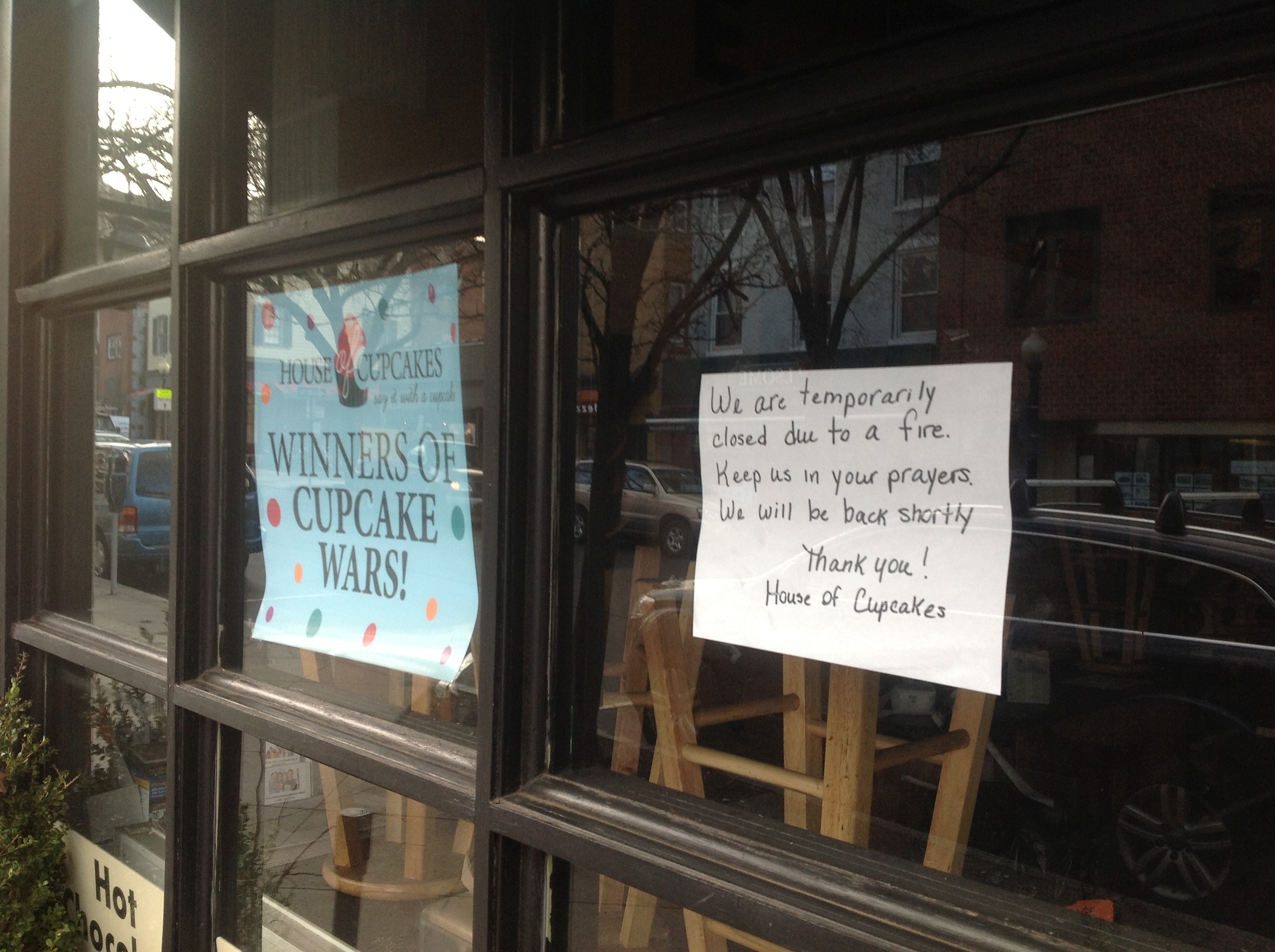 A sign at Princeton’s ‘House of Cupcakes’ on Witherspoon Street shows that the store is closed after a recent fire. (click to expand.)