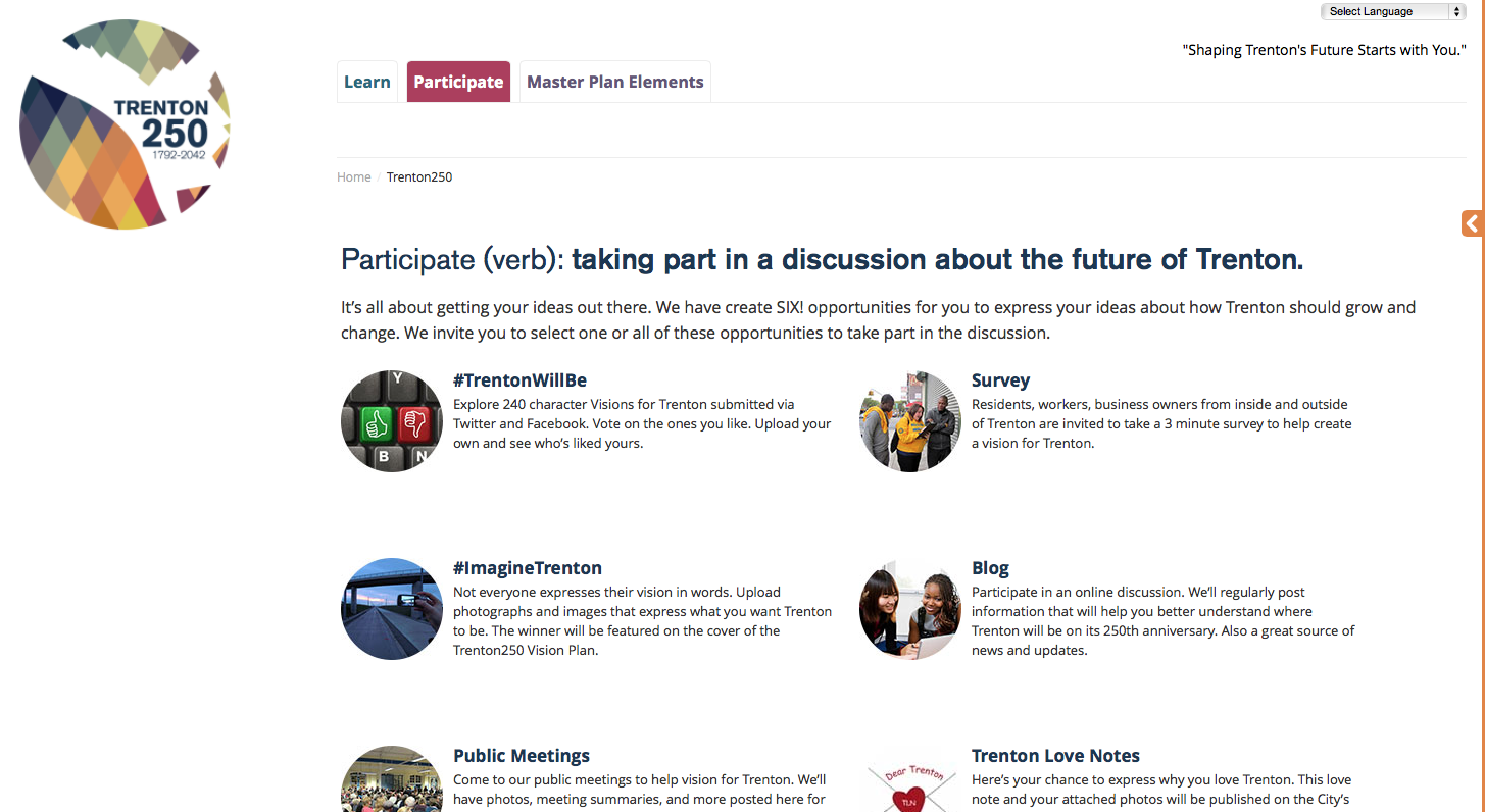 Screenshot of Trenton Community Masterplan website ‘Trenton250.org‘ (click to expand.)
