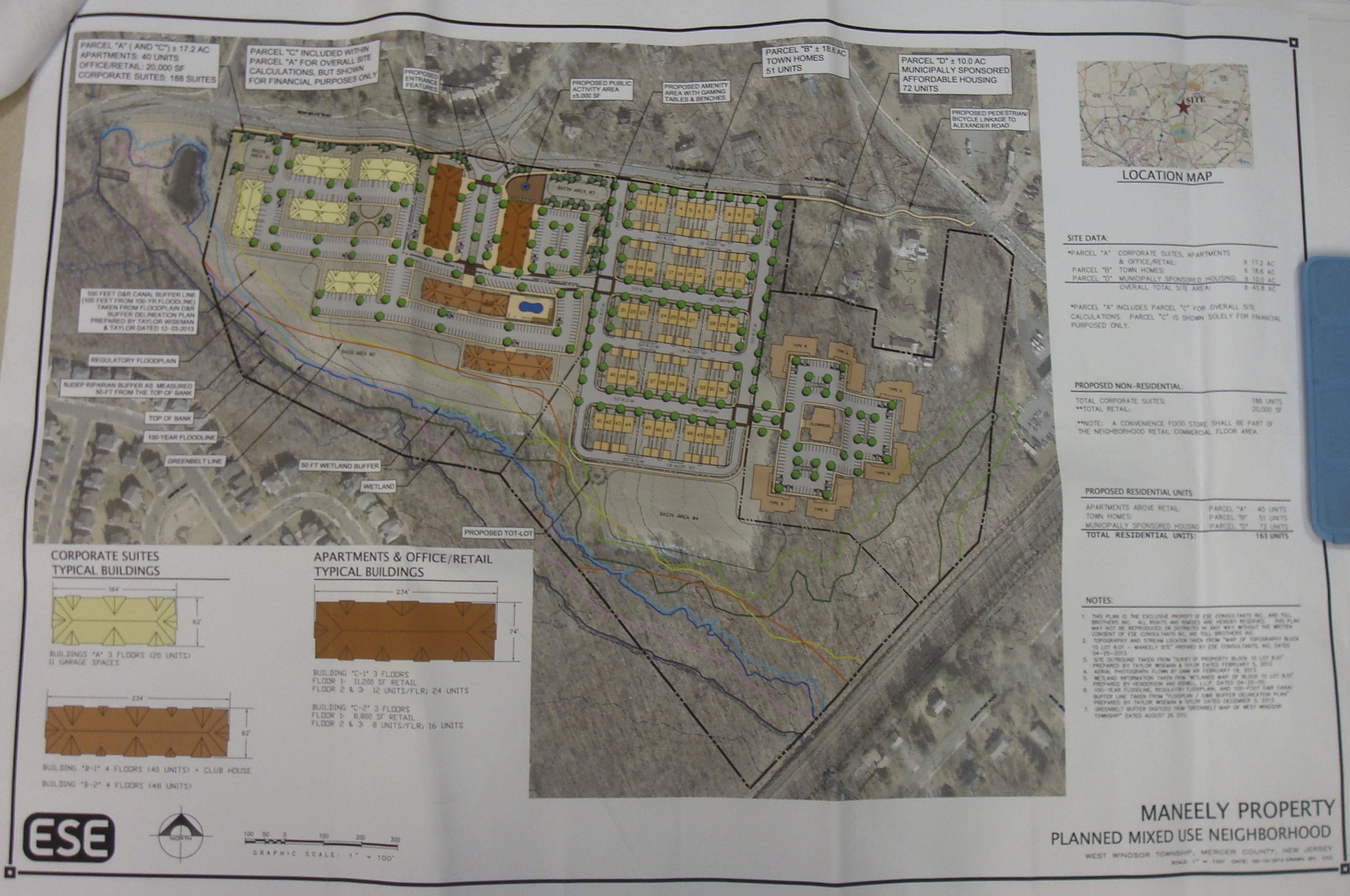 Toll Brothers have proposed a mixed use development at Bear Brook Road and old Bear Brook Road in West Windsor- a site sometimes know as ‘the Maneely property’. The plan, developed in conjunction with West Windsor township, calls for 188 ‘corporate suites’, 4o apartments, 51 town homes and 20,000 sq ft of commercial space. A 10-acre plot on the site is set aside for a 72-unit affordable housing development, which will potentially be constructed by Project Freedom. The plan was presented to the West Windsor Planning Board earlier this month. The details are below.