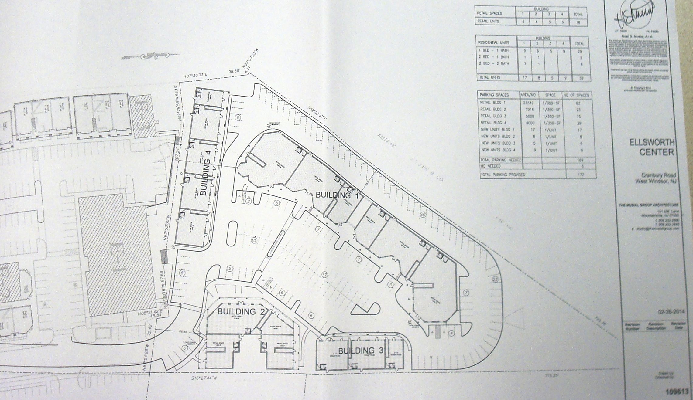 West Windsor seems to be on an apartment surge, with plans for a mixed-use neighborhood off Bear Brook Road, and the recent approval of a mixed-use redevelopment of the ‘Ellsworth Center’ at Cranbury and Route 571 (Princeton-Highstown Road). The Ellsworth Center looks set to be the site of not one, but two mixed-used redevelopments, as a new plan has been put forward to redevelop the ‘Ellsworth II’ parcel at the back of the site! The site plans are below…