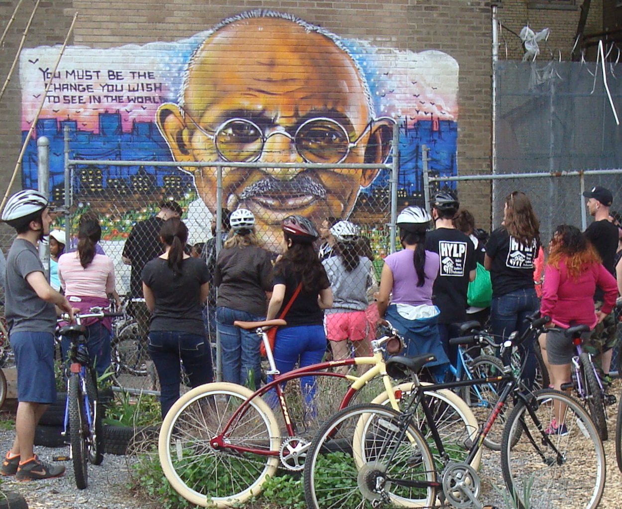 Riders inspect a mural of Mahatma Ghandi during the Trenton Social Ride. ‘Ghandi Garden’ is a project of the S.A.G.E. coalition, who are planning a mural at Princeton’s Paul Robeson Center. (click to expand).
