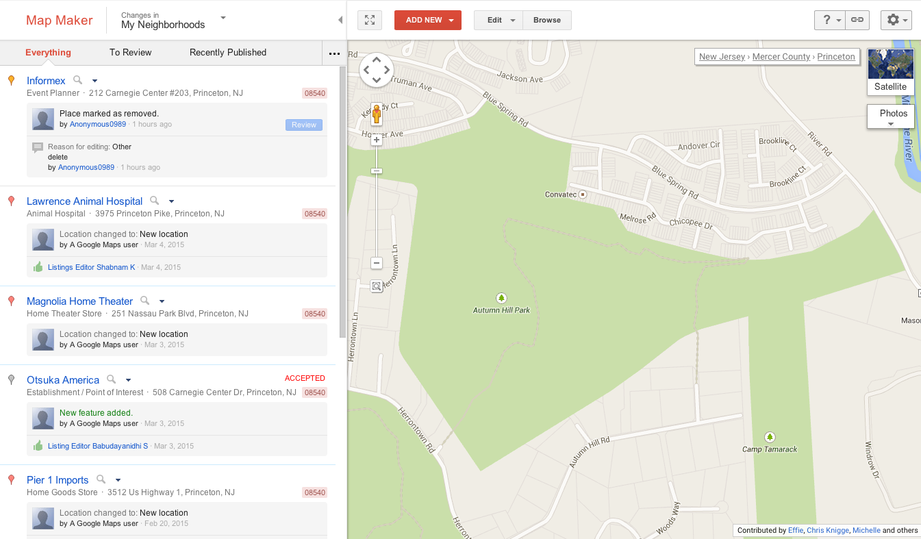 After you make edits, you will probably have to wait until another user ‘approves’ your edit before it appears on the official Google Maps. This is slightly annoying but necessary to stop spammers and abusers from putting useless data onto the system. The more editors we have in Princeton, the quicker we can collaboratively get changes approved, and add all our local knowledge. Right now, the quality of the map data is very variable. Some places, such as Princeton University campus, have loads of detailed info. Other places have almost no data, or very poor data. For example, the trails in Woodfield Reservation are completely missing, and the entire 100-acre park is currently tagged only with the words ‘Stony Brook’: