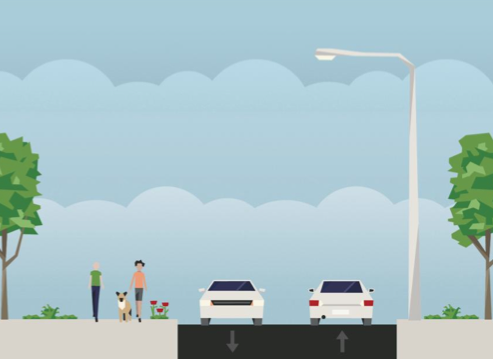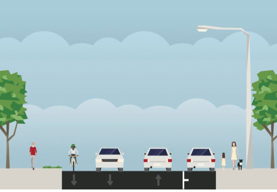 Proposed new street design on Mt Lucas Road between Laurel Road and Ewing Street. Upgraded sidepaths, and a new bike lane on one side of the road (click to expand).