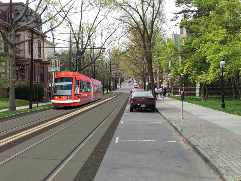 A task force set up to consider upgrades to transit service along Alexander Street and University Place is set to present a final report to Princeton Council. Their ‘preferred alternative’ is a streetcar/light rail service operating on the existing Princeton Branch rail line between Princeton Junction and Princeton Station, which would then continue via a dedicated track on the east side of University Place to a new stop in downtown Princeton on Nassau Street. The cost of building the new system would be at least $45 million.