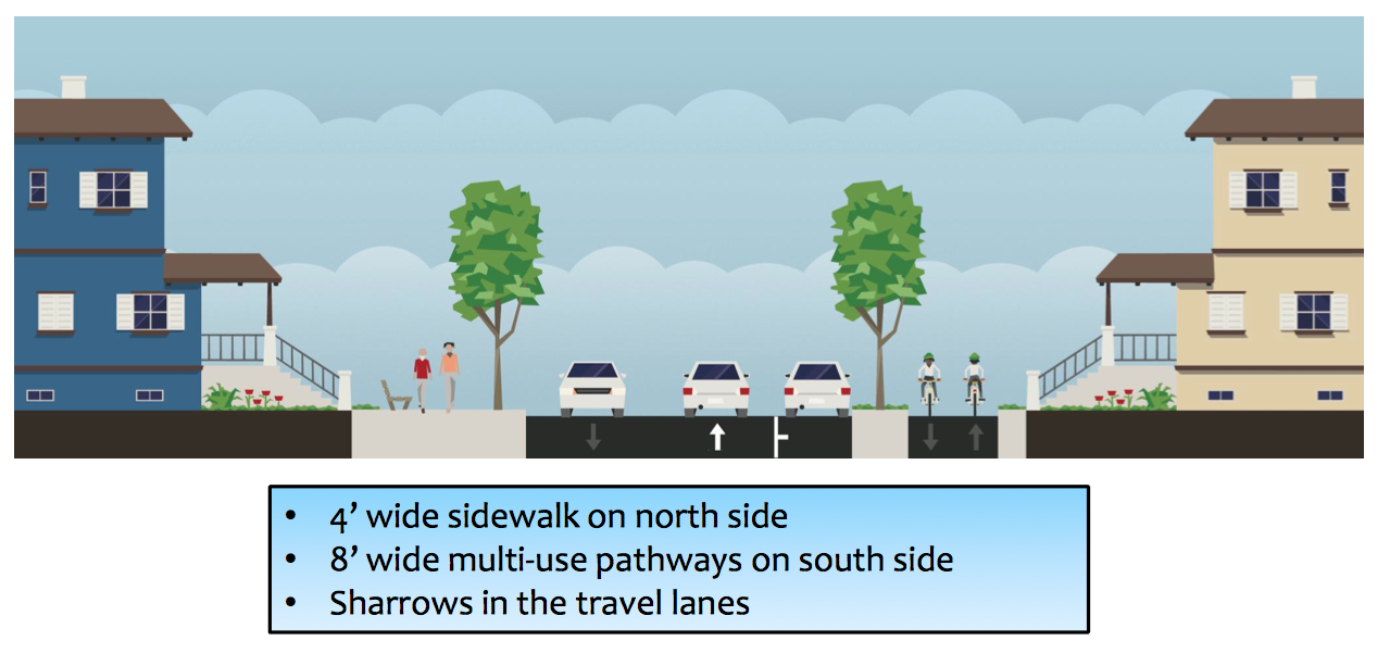 To reduce speed, and improve options for cyclists, we should add a separated bike lane on the north side of Valley, heading west. This would mean that cyclists heading west have the best and safest type of facility. It would reduce the number of bicycles on paths, and help limit the speed of vehicular traffic. On the south side, an 8-ft sidepath, consistent with FHWA standards seems like a good fit, because it is hard to make a second on-street bike lane work with the existing trees. We should include new, attractive, pedestrian-oriented lighting to improve aesthetics and address neighborhood concerns about how dark the paths are at night. The concept would look like this: