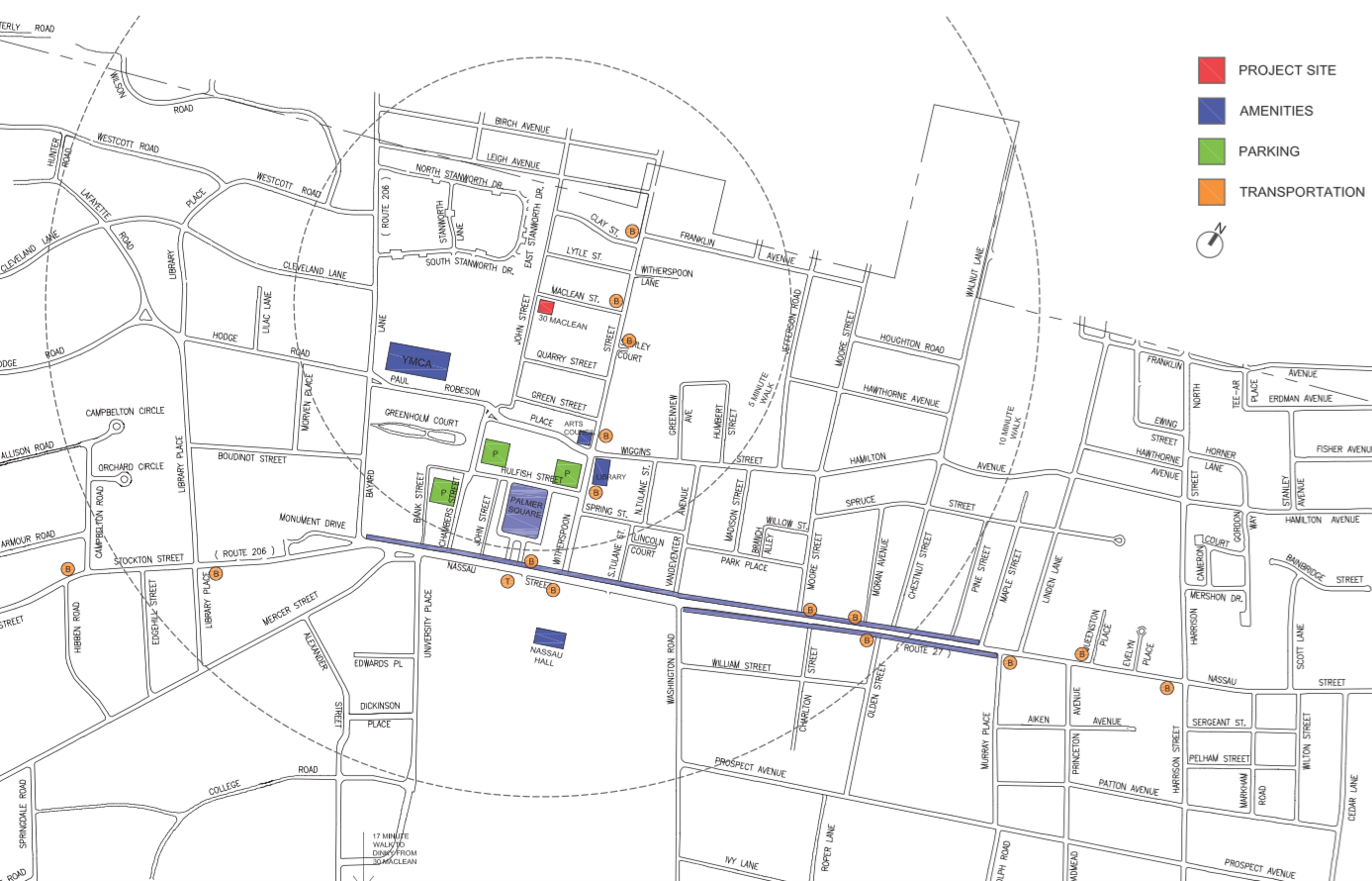 The adaptive reuse of the building promises to create something very special, but another massive advantage is that the proposed apartments will be within easy walking distance of hundreds of Princeton businesses and workplaces. As seen in the ‘walkshed’ map below, Palmer Square and the central business district are a 5-minute walk away, and many parts of the University campus and Theological Seminary are just 10-minutes away by foot. The Dinky station is just a 17-minute walk away, and there are bus-stops literally at the end of the block. This is about as good as it gets for people who want to live car-free.