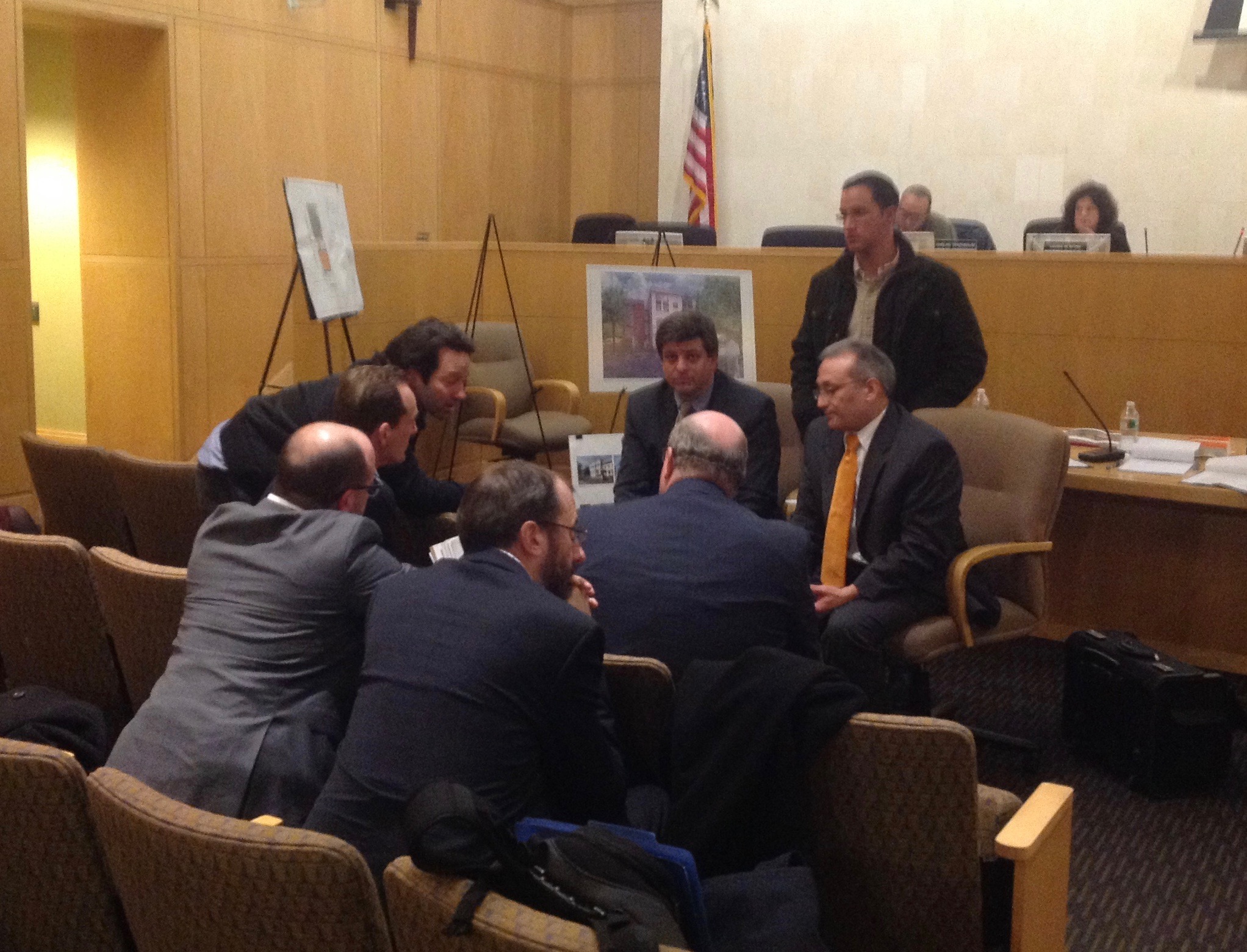 Josh Zinder (facing camera) confers with his team during a break at the Princeton Zoning Board Meeting on Wednesday night (click to expand)