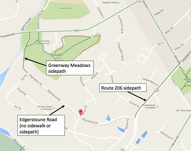 The town of Princeton has a sidewalk masterplan, but this masterplan does not list Edgerstoune Road as a potential site for a future sidewalk. Instead, a somewhat circuitous sidewalk route was planned to run between Greenway Meadows and Route 206 via Hun Road and Russell Road. It’s not clear that neighbors on these streets would be more receptive to a sidewalk than residents on Edgerstoune Road, and the link remains unbuilt. For now, as neighbors continue the discussion, pedestrians in the area are advised to exercise caution.