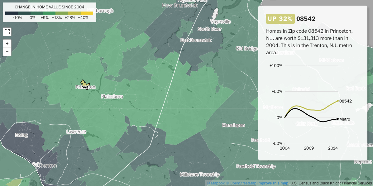 Map of home value changes since 2004 in Princeotn Area. via Washington Post (click to expand)