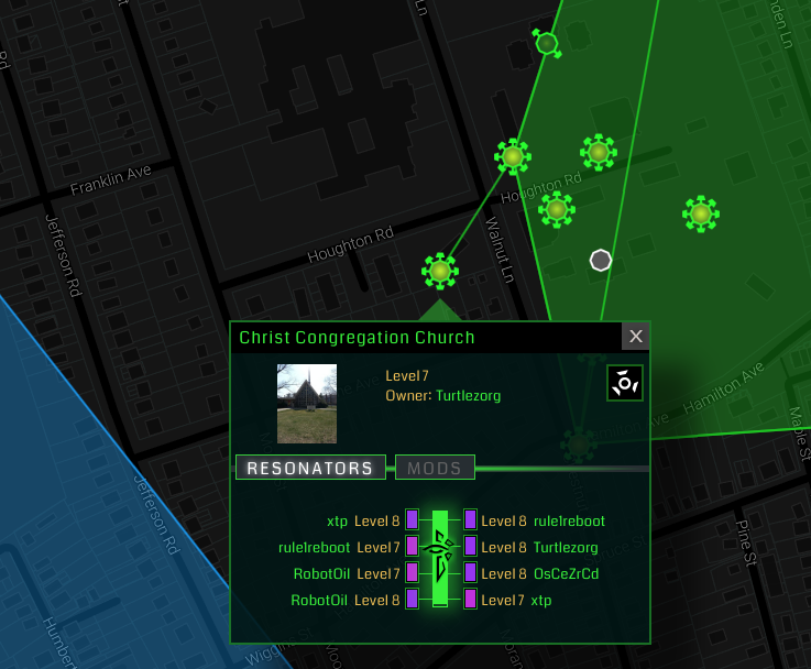 Ingress players download the game onto a GPS-enabled smart device, which tracks them as they move around real-world locations. All players join one of two ‘teams’, and can advance in the game by capturing territory for that team. In practice, this requires the player to visit a bunch of sites in the real world to collect ‘weapons’, and then use those weapons to ‘capture’ the sites. This is all great fun (if you’re a geek) but the game has developed into something of an online guidebook to Princeton’s most important historic and cultural sites. Consider the Christ Congregation Church on Walnut Avenue (pictured above). In the Ingress game, it is a designated ‘portal’, which looks like the image below. We can see that at least 5 different players have recently visited it, to claim it for the green team: