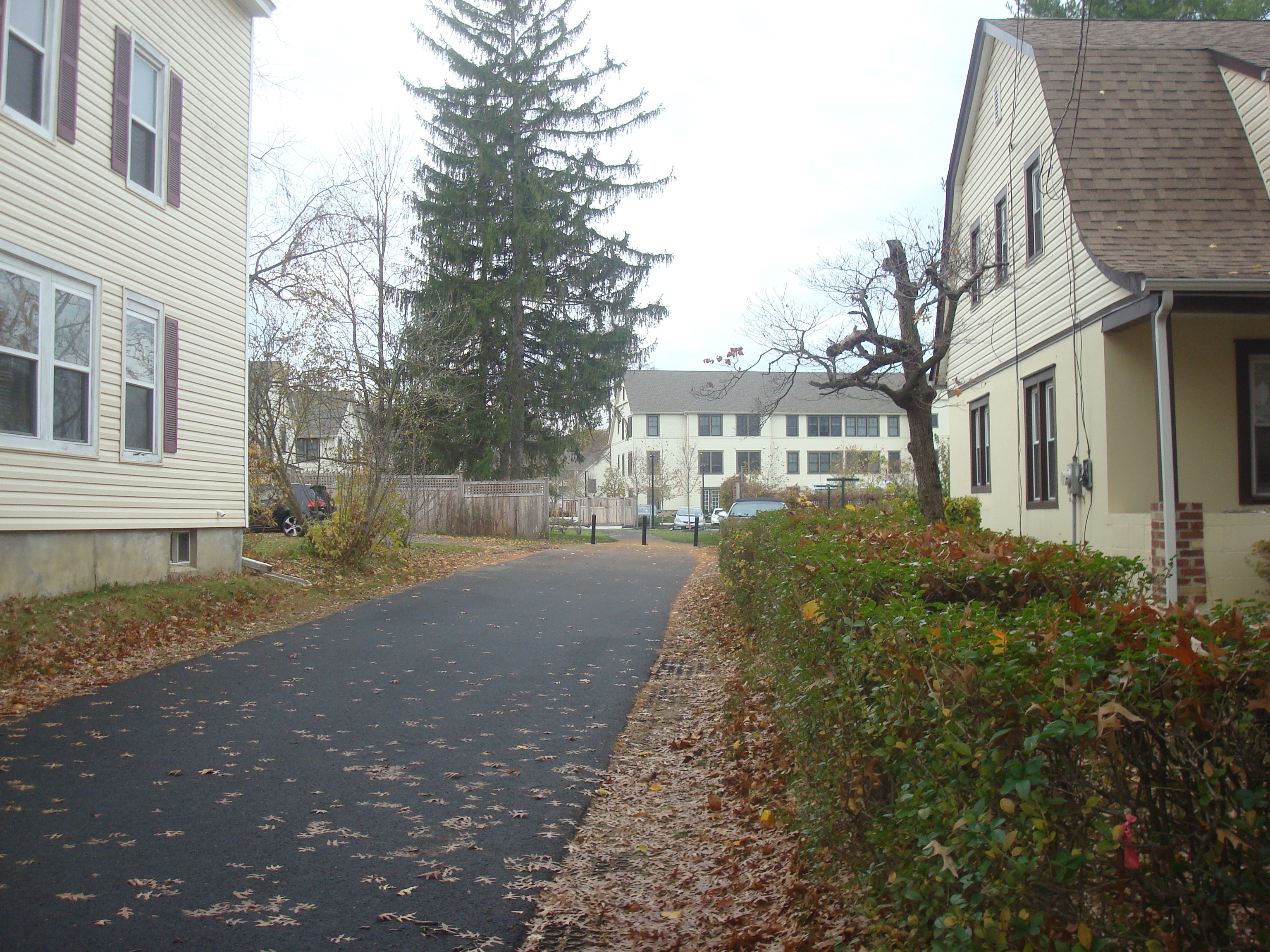 The Merwick-Stanworth development is only connected by road to Route 206, but various walk-bike paths provide access to John Street or Paul Robeson Place (via the YMCA site). The multi-use paths are of variable quality. Some of them are too narrow to easily accommodate cyclists and walkers, whereas other meet the required standard of at least 8-ft.