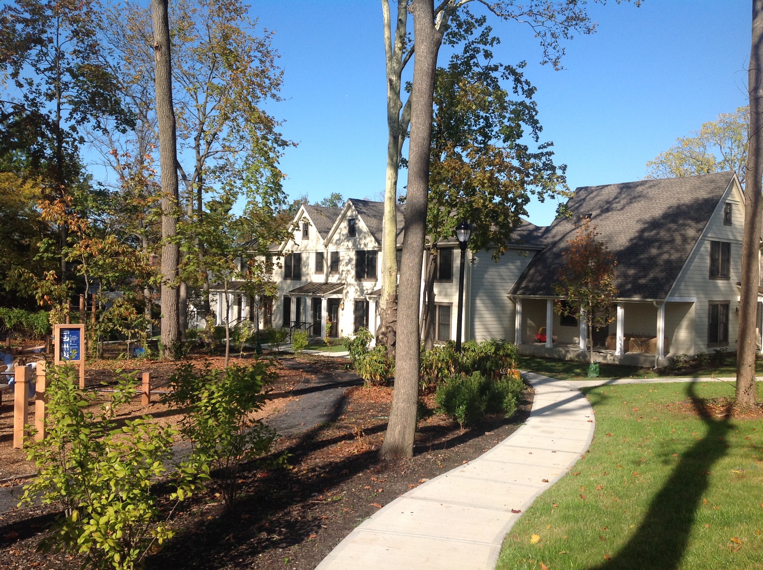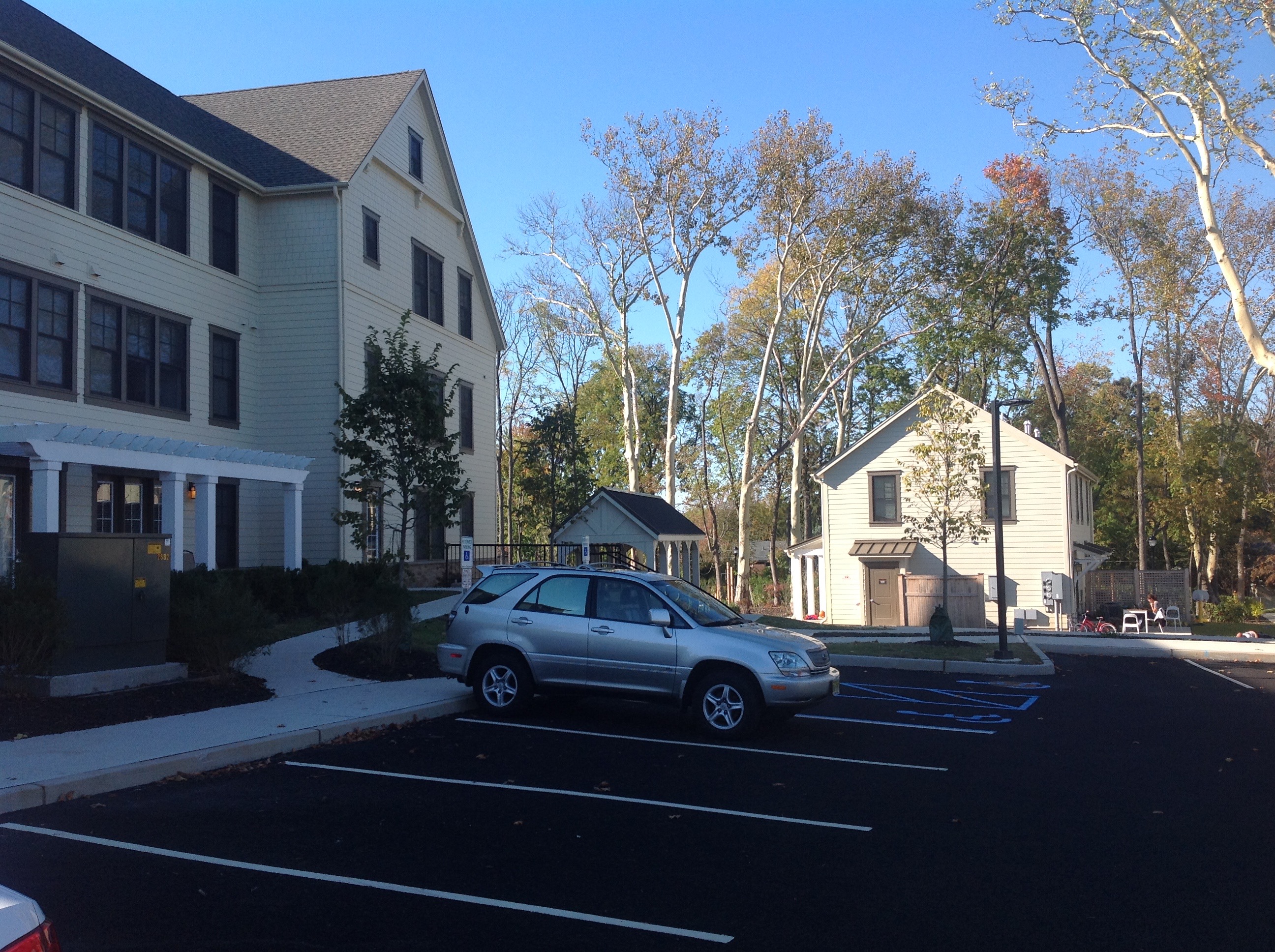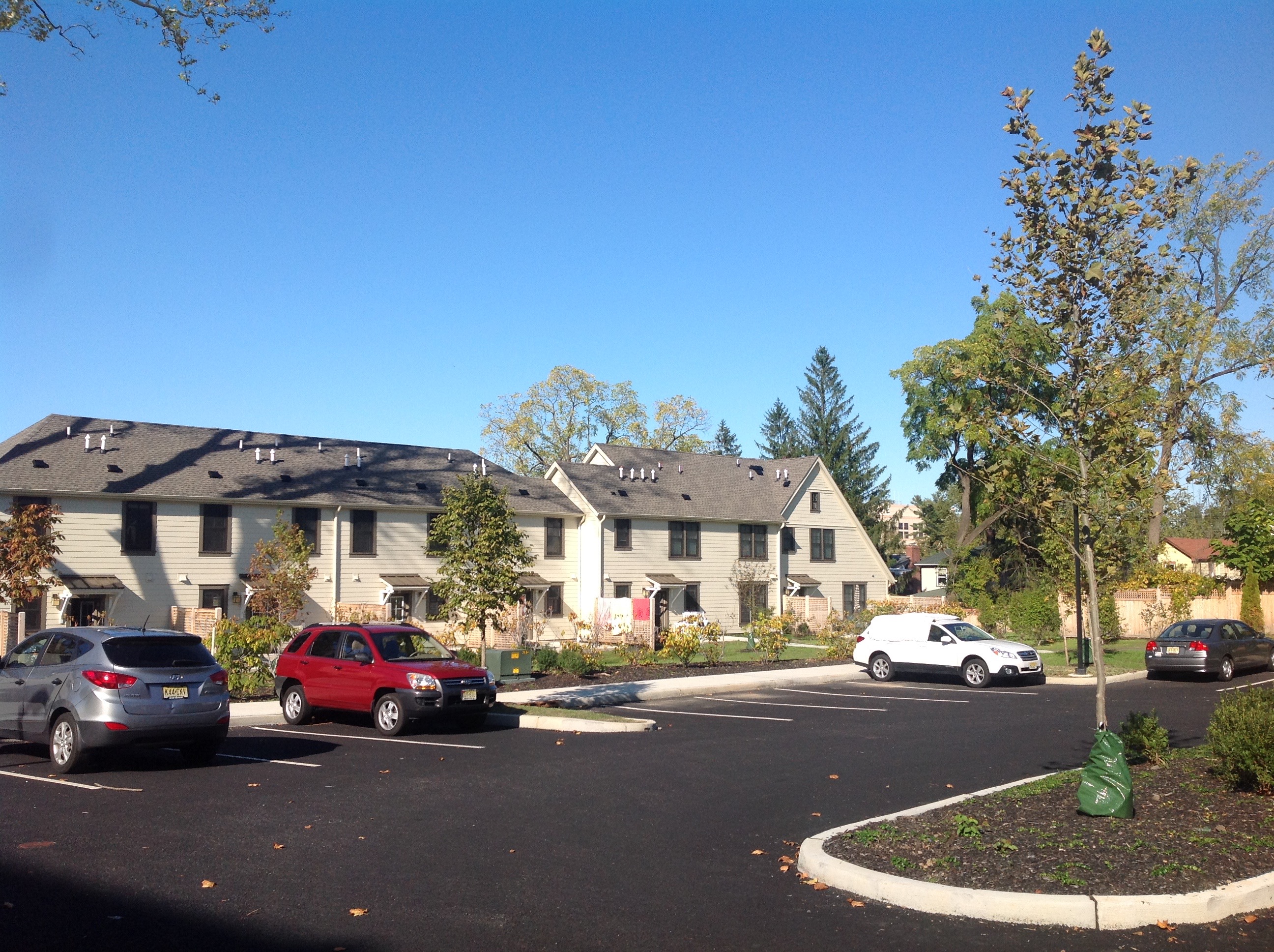 Most of the homes are 2-level townhouses. Although the site is very close to downtown, with a ‘walkscore‘ of 77 (very walkable), the overall atmosphere is suburban. Parking for cars is plentiful, but the only entry and exit points for vehicles are from Route 206, so there is basically no through traffic. The houses are surrounded by significant patches of landscaped green space, and there is even an exercise circuit in the middle.