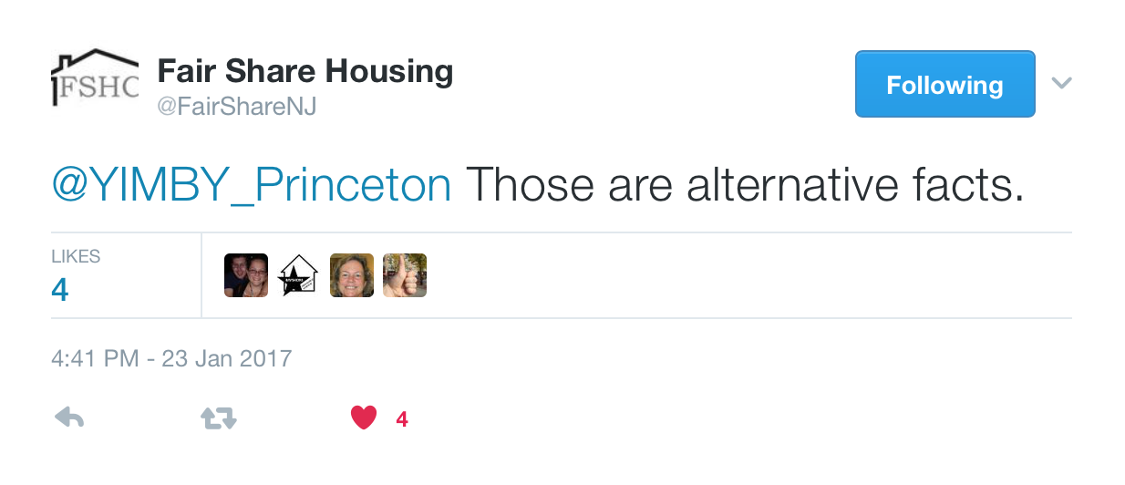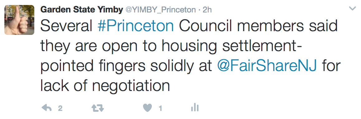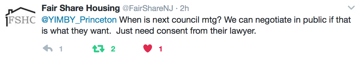 Princeton Council members expressed anger and frustration at their regular meeting Monday night after being presented with a 200-signature petition urging a compromise in their ongoing affordable housing litigation. In front of a packed town hall, several Council members publicly blamed the Cherry Hill, NJ-based housing advocacy group ‘Fair Share Housing Center‘ for the lack of progress in agreeing a figure for how much affordable housing Princeton should build. But Fair Share hit back on Twitter, accusing the Council members of presenting ‘alternative facts‘, and offering a fully-public negotiation session.