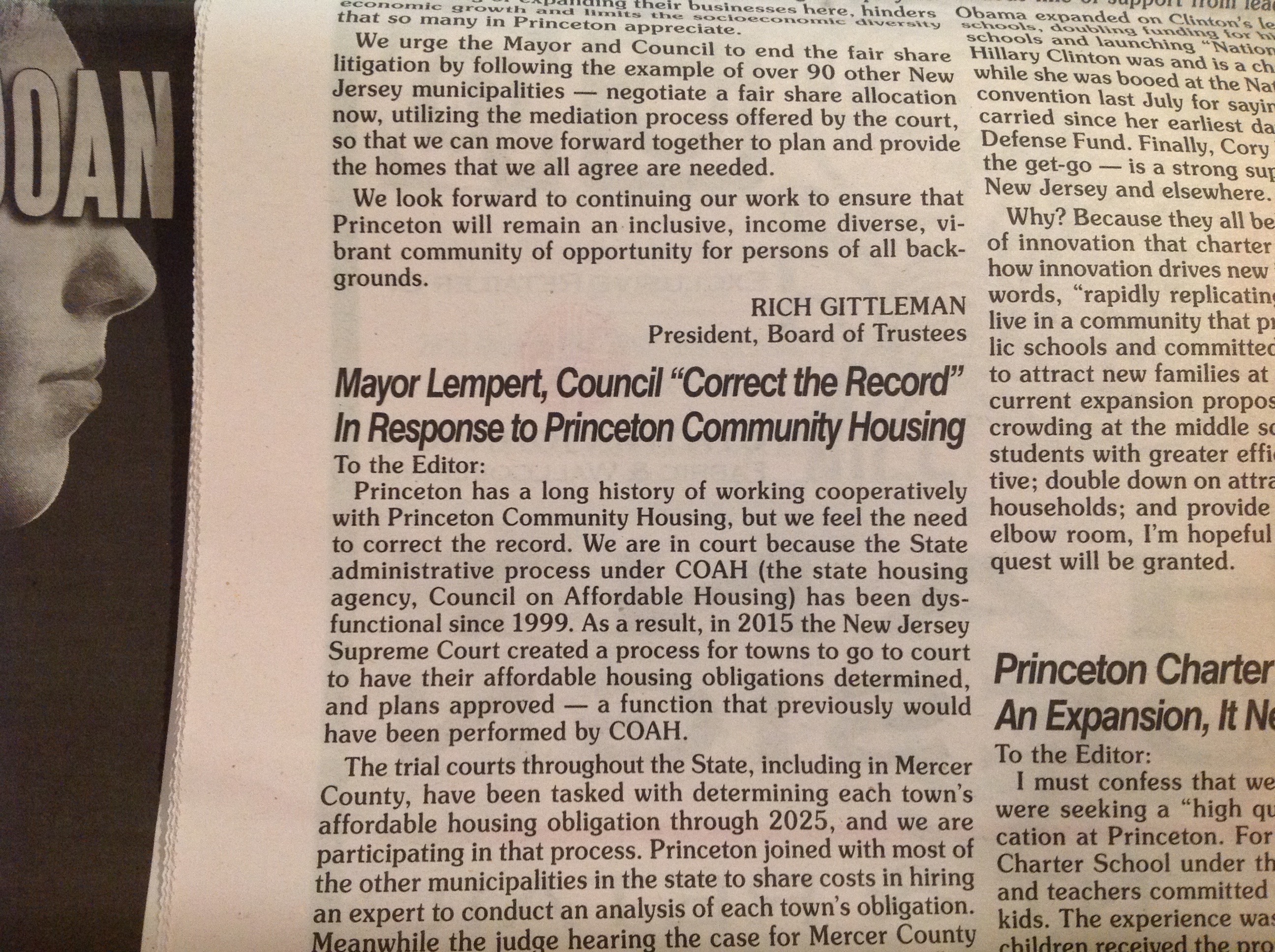 The Town of Princeton’s ongoing litigation over affordable housing took an unusual turn this week as Mayor Lempert and the members of Princeton Council issued a letter to local newspaper ‘The Town Topics’ defending their legal fight. In response to a letter from long-time affordable housing advocates that called for a settlement in the town’s court battle, the Mayor and Council members issued their own statement aiming to ‘correct the record’. The town also published a ‘Frequently Asked Questions’ document on the municipal website, aiming to update local residents about what is happening with the court case. Unfortunately, both the letter in ‘Town Topics’ and the online ‘Frequently Asked Questions’ contain out-dated information, which serves only to confuse the matter.