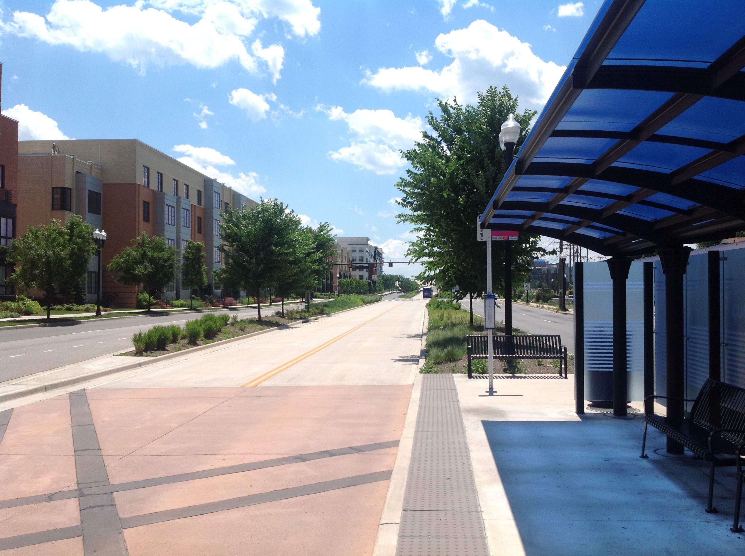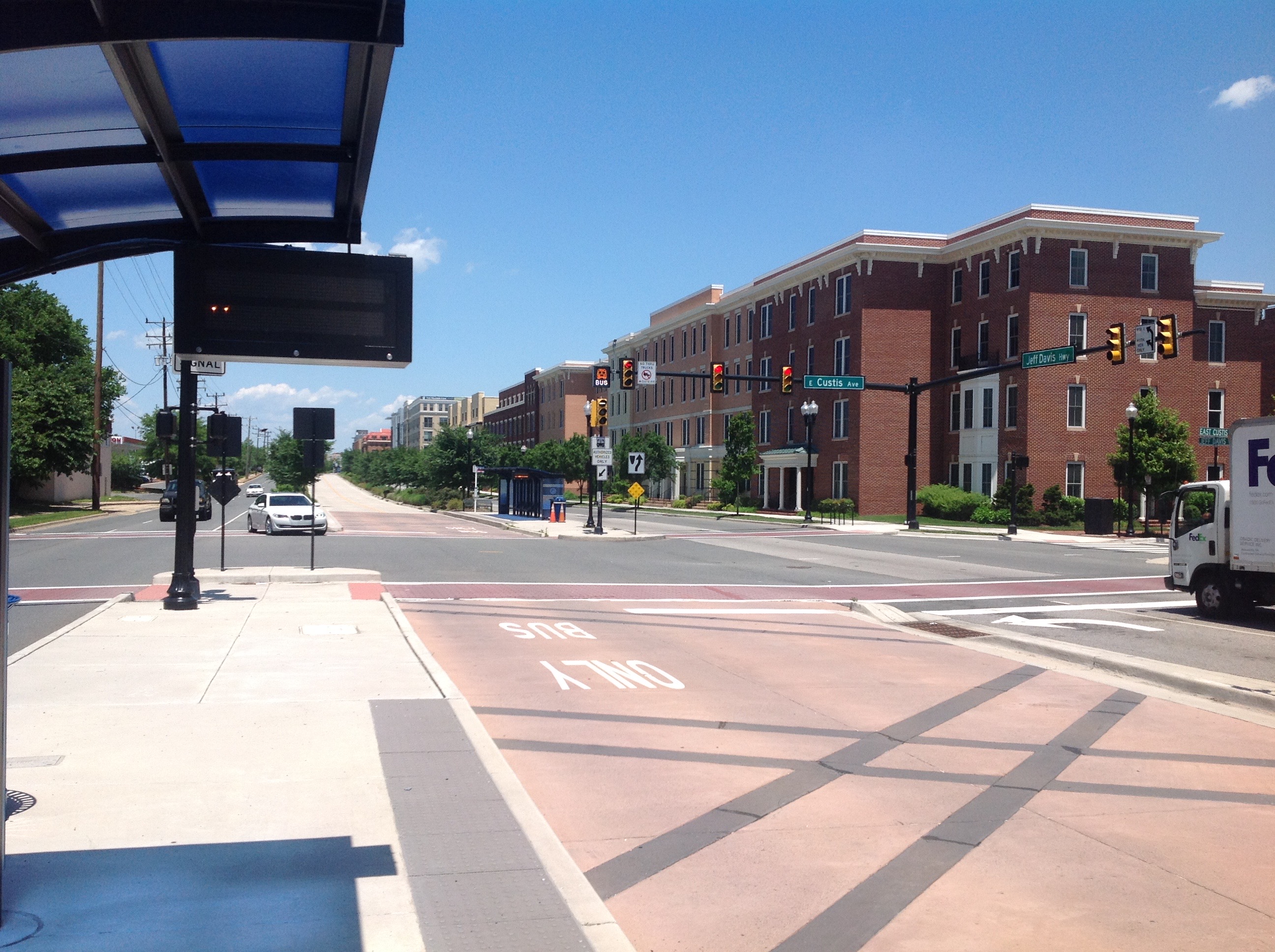 The ‘Metroway‘ bus system opened in 2014, connecting Arlington, VA and Alexandria, VA, two towns in the suburbs of Washington DC. As in Central New Jersey, US-1 runs through these towns (in fact, it runs the entire length of the US east coast!). But like in New Jersey, it can suffer from bad traffic here. To improve transit options, an improved bus service was launched. A key feature of this bus service is that it runs for much of its route in a dedicated busway, which is located in the center (median) area of US-1 (see pictures above and below). That means that the bus can glide past traffic, offering a way to move lots of people quickly between points on US-1. The bus stops are also in the center of the road, and have upgraded shelters and real-time arrival information ot let you know when a bus is coming.