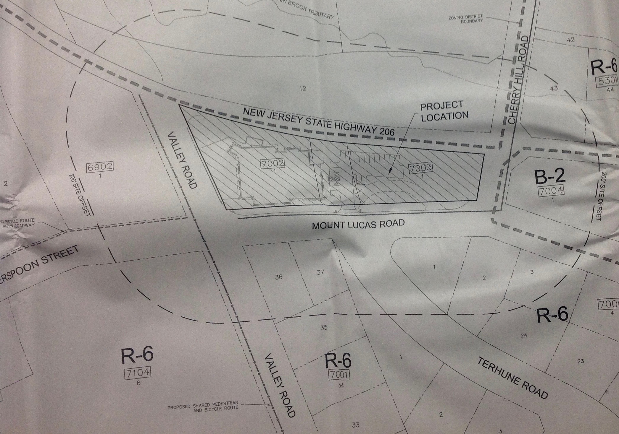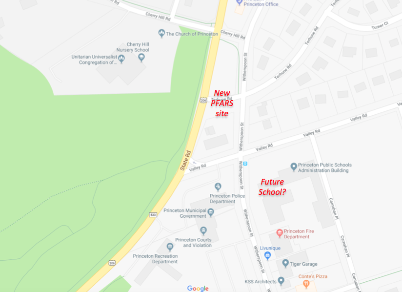 Here is the site as seen on ‘Google Maps‘. The site is quite close to Community Park Elementary School, and potentially directly across the street from the Valley Road School site, which is likely to become a new ‘pre-middle school’ under plans being drawn up by Princeton Board of Education. To the west lies Community Park South, with its extensive trail network:
