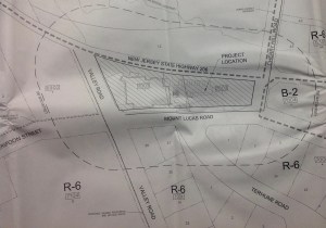 Viewed in more detail, we can see that the ambulances and emergency vehicles will exit from the south of the building, onto Valley Road. New traffic signals will be installed at the intersection of Valley Road and Route 206. The 20-space parking lot will be accessed via a curb cut at the new 3-way intersection formed by Terhune Road and Mt Lucas Road: