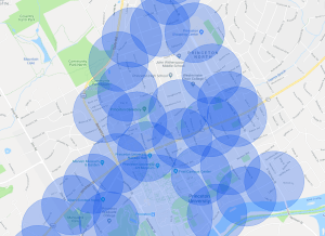 Areas in Princeton served by transit. Blue circles indicate 5-min walk to transit. (Click to expand)