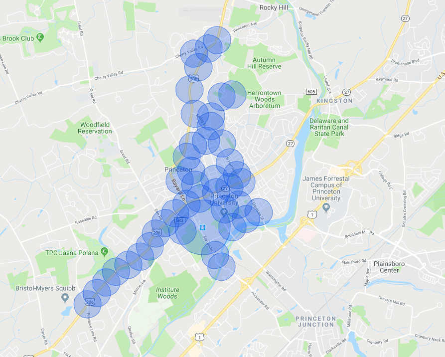 Areas in Princeton served by transit. Blue circles indicate 5-min walk to transit. (Click to expand)