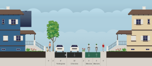 Residential Street Concept for Wiggins Street, Princeton, with safe bike facilities, parking, reduced traffic volume (click to expand).