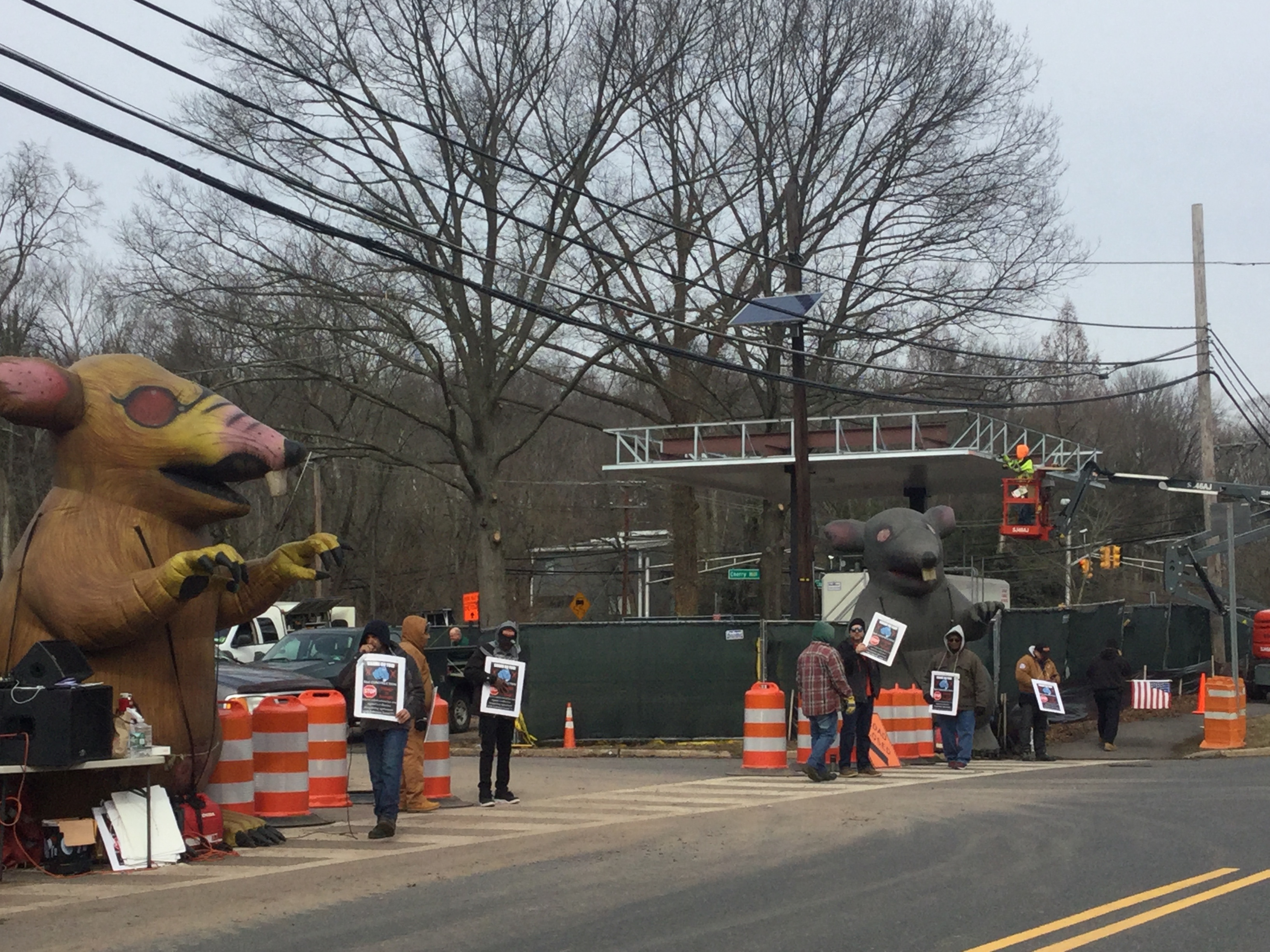 Demonstrators from a local labor union showed up at Witherspoon Street and Terhune Road in Princeton today, bringing their giant inflatable rats with them. Shouting “No Justice! No Peace!” and “Princeton is a Union Town”, the protestors waved placards at passers-by. The protest appears to be focused on the construction of a new gas station at the site, which is at the top of Witherspoon Street near the intersection of Mt Lucas Road, Cherry Hill Road and Route 206.