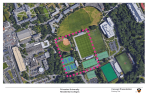 The University has given the new Colleges the provisional names ‘College 7’ and ‘College 8’. They are connected on the same site, which is currently a site for athletics. The athletics facilities will be relocated to the new Princeton University ‘Lake Campus‘, to the south of Carnegie Lake, in West Windsor. University Architect Ron McCoy emphasized the pedestrian connections to other parts of the campus. The buildings will have a ‘contemporary’ architectural style, with a narrow form, and extensive walking paths and landscaping. The central path on the site, between the two new Colleges is called ‘College Walk’. Each College will have its own dining hall, with a shared kitchen.