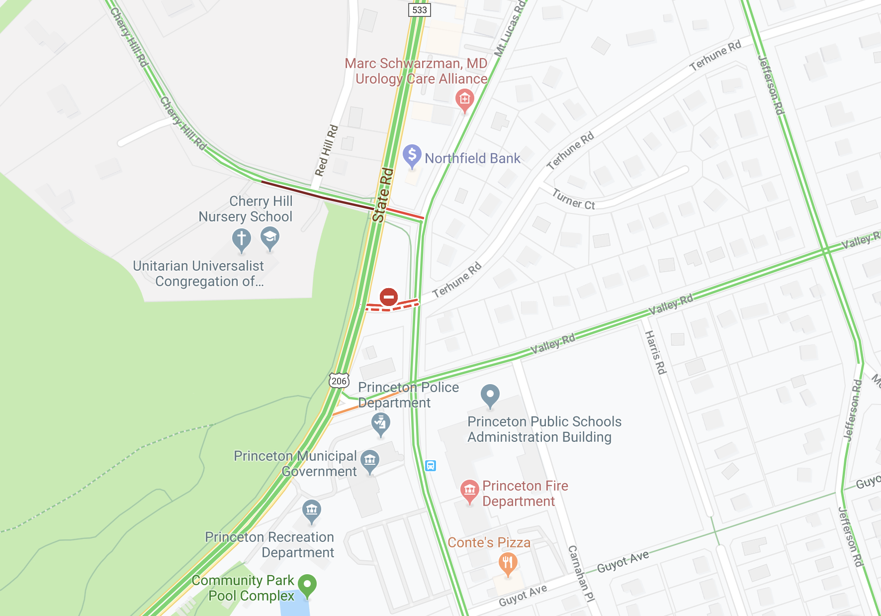 Earlier this year, the town of Princeton closed part of Terhune Road to provide space for a parking lot for a new PFARS ambulance station. The town did not have a workable traffic management plan in place at the time of the road closure, and drivers who formerly used Terhune Road to access Route 206 have mostly detoured to the intersection with Cherry Hill Road. Neighboring residents have found that the intersection of Cherry Hill Road and Route 206 is now subject to serious delays, and drivers struggle to safely turn onto Route 206. To try to resolve these issues, the town hired consultants to attempt to find ways to speed traffic through the intersection. In a report to Council in July, they suggested design changes for the intersection that might improve the flow of car traffic.
