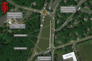 The option of allowing left turns onto US-206 from Valley Road was also discussed. This would take the pressure off the Cherry Hill Road intersection, but the consultants concluded that it is unsafe, because of the volume of traffic and restarted sight-lines. Left turns could be made safely if a traffic signal was added, but the state Department of Transportation will not allow it, because the traffic signal would be too close to the traffic signal at Cherry Hill Road. They are willing to allow an emergency traffic signal for occasional use by the ambulance station, but it turns out that there is not even enough space to build an emergency signal. The land on the west side of US-206 is protected by the state “Green Acres” program, therefore it is either difficult or impossible to build any traffic signal at this intersection to the appropriate standards.