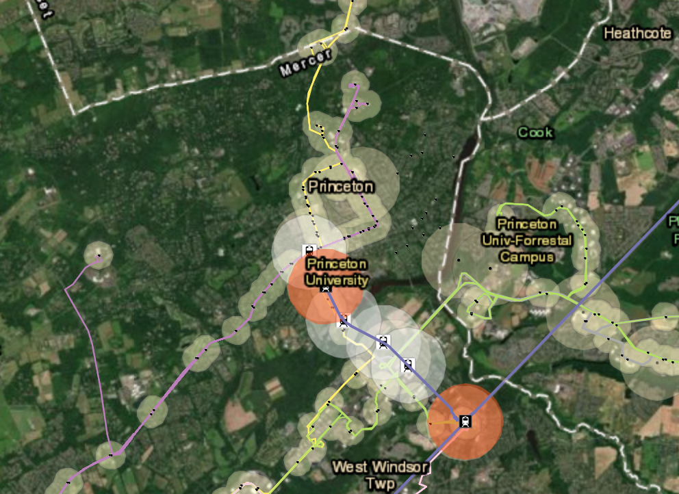 A key principle is that mixed-use, affordable housing should be incentivized in areas that are served by existing bus and rail routes. New Jersey Governor Phil Murphy took steps in early October to accelerate the development of parking lots and other land owned by NJ Transit, near existing rail stations. In Princeton, however, there have been no serious efforts to encourage development near transit, despite the recommendations of the ‘US-1 Growth Strategy‘ to implement ‘transit-supportive zoning’. What would it look like if Princeton moved to a transit-oriented master plan for housing? A map that accompanies the ‘Transit-Oriented Smart Growth Vision’ shows areas around existing and proposed transit stops, which would potentially be sites of higher-density housing in future. In Princeton, it looks like this: