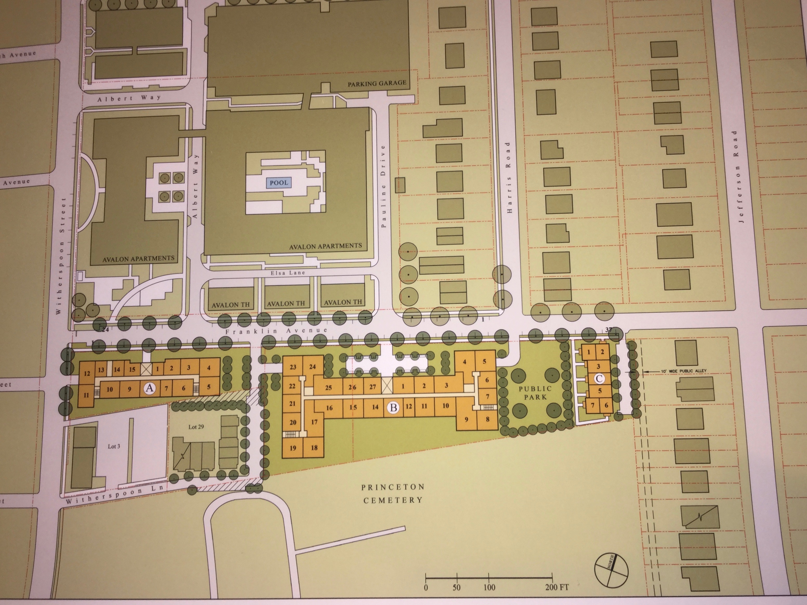 Joel Schwartz, a Princeton-based planner, then presented his own plan for Franklin Ave. He envisioned a 160-unit project, in which 80 of the new homes would be designated affordable units, to meet the town’s court settlement, and the other 80 units would be market-rate units. Schwartz’s plan also includes a new road connection from Witherspoon Lane to the site, so that cars entering and exiting the new development would have another option instead of all using Franklin Ave. An entrance to the north side of Princeton Cemetery is also part of his plan, providing the possibility of using walking paths in the cemetery to connect from Franklin Ave to downtown Princeton.