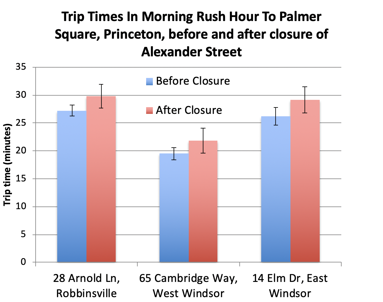 Travel times into Princeton from three local addresses before and during Alexander St bridge replacement project (click to expand)