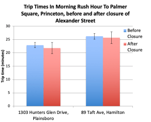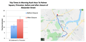Although our study rules out the idea that the Alexander St road closure caused widespread, crippling delays, it is possible that there were significant traffic impacts for a subset of trips into or out of town. For example, anecdotally, delays in the evening rush hour have been worse than in the morning rush hour. A broader survey based on real-time traffic data might reveal such a difference. Shortly before it was disbanded by Council, the Princeton ‘Complete Streets Committee’ was exploring such approaches with traffic expert Dr. Thomas Brennan. We also don’t yet know if there has been an increase or decrease in crashes since Alexander St closed. This will require a study of accident reports before and after the construction project began, for all roads leading into Princeton. But for the most part, the closure of Alexander St has been a challenge that Princeton seems to have taken in its stride. As the chief of police now says, “the overall traffic volume impact on our local roads has not been as bad as we expected”.