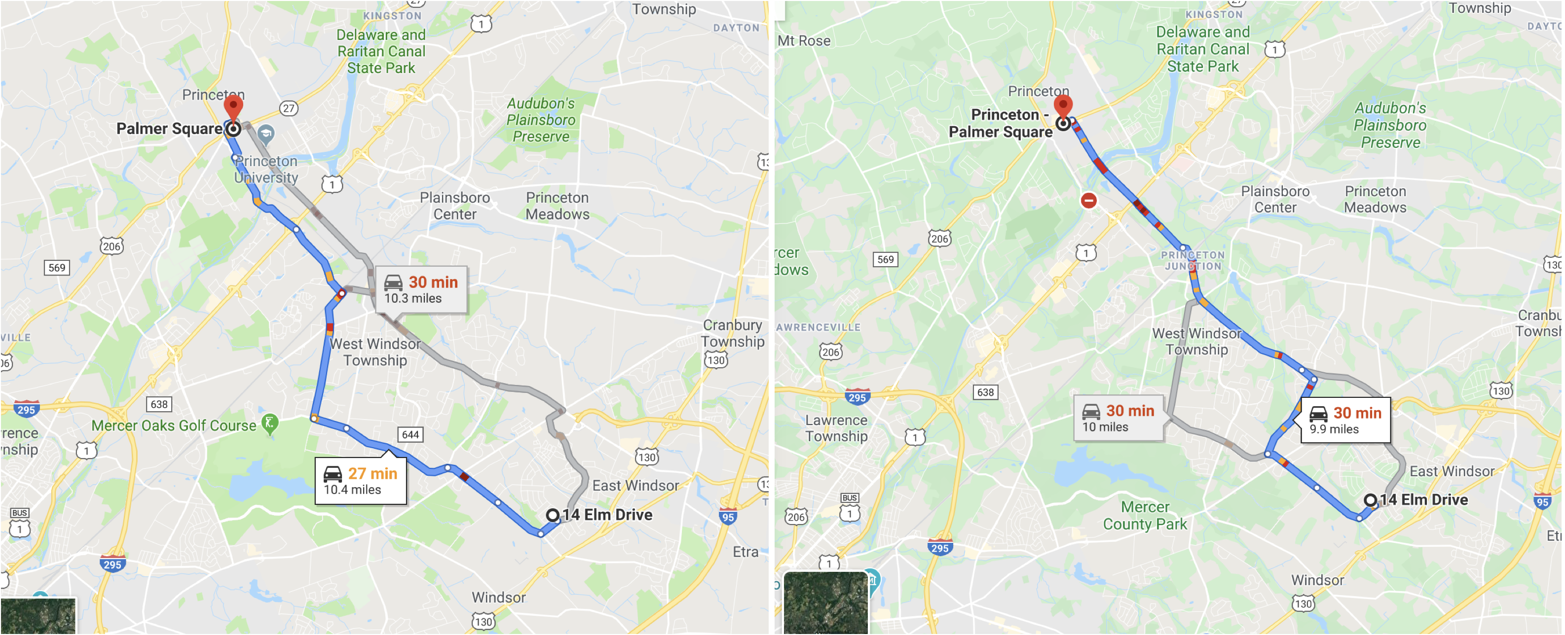 Example of screenshots showing fastest travel times from an address in East Windsor to downtown Princeton. Left: before closure of Alexander St  (5/15/2019). Right, after closure of Alexander St  (2/26/2020). (click to expand)